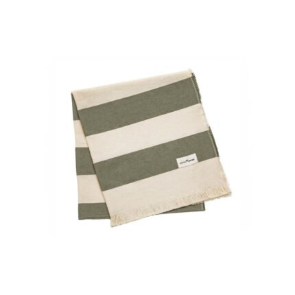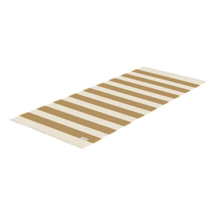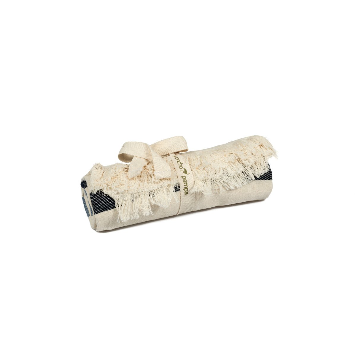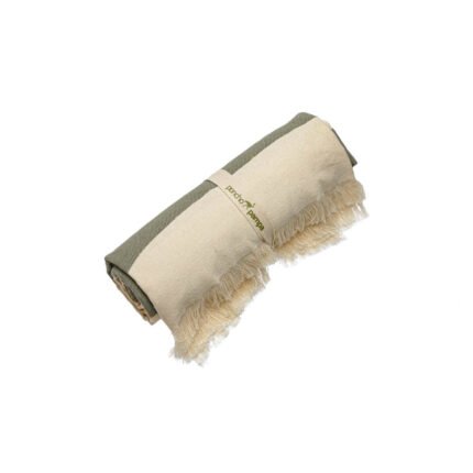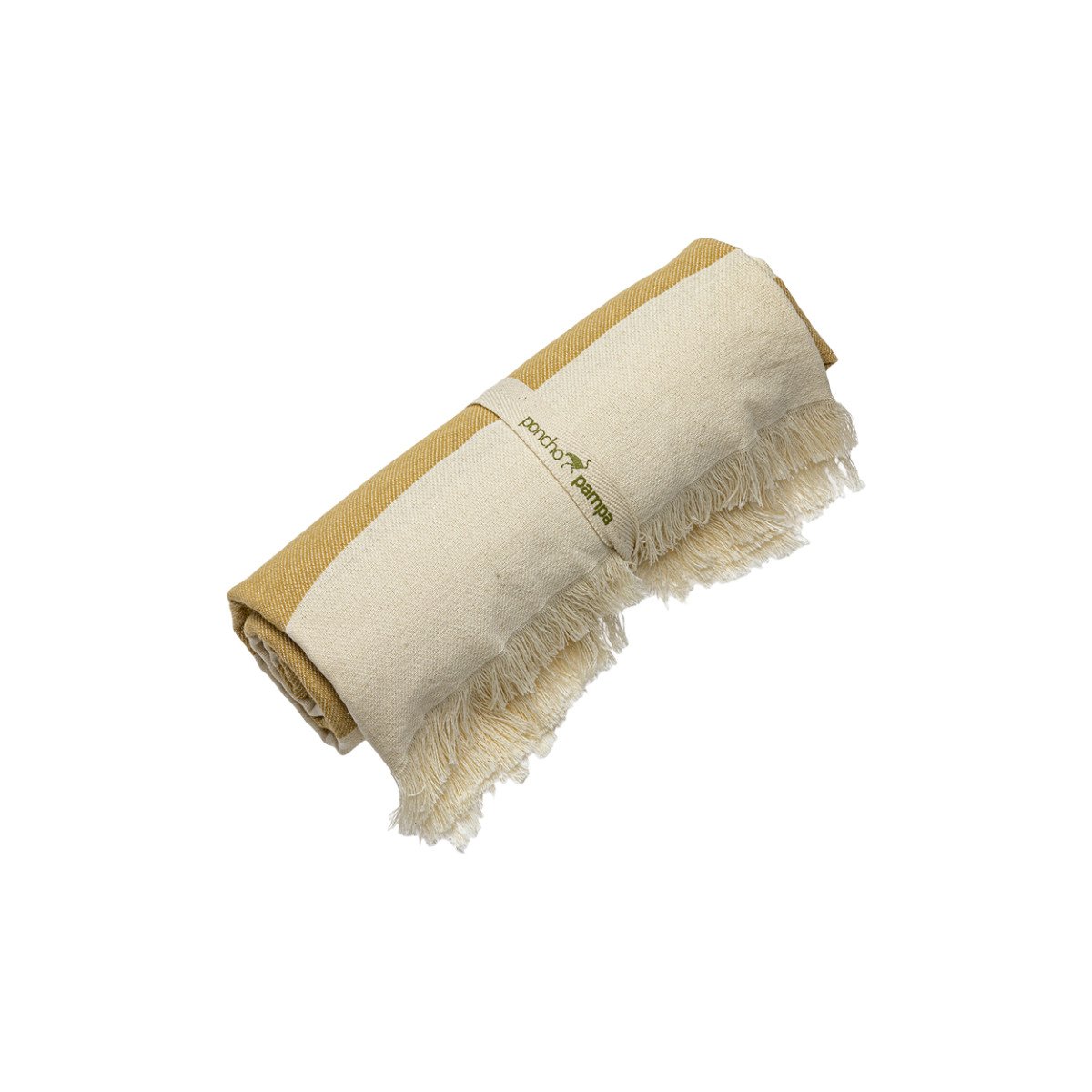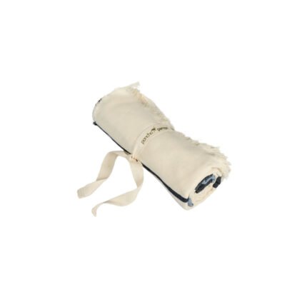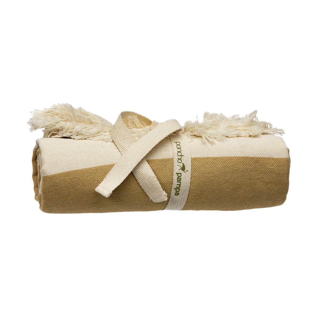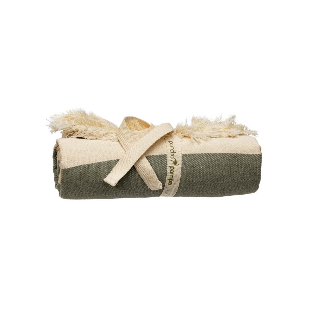 Lona rústica tejida rayada, con flecos. Diseñada para enrollarse con su cinta y poder trasportarla fácilmente.