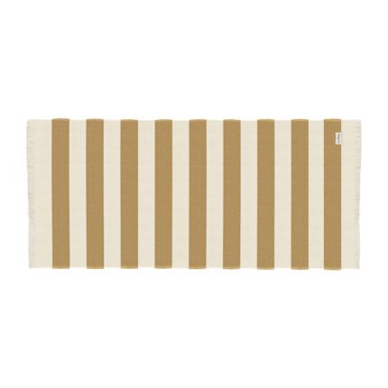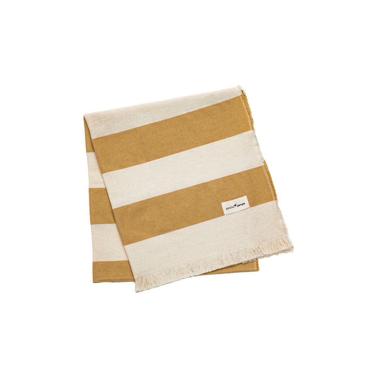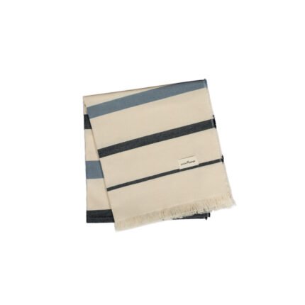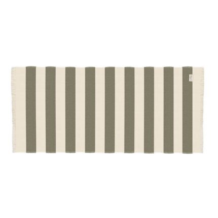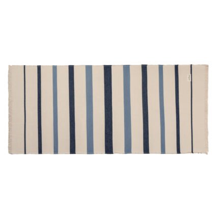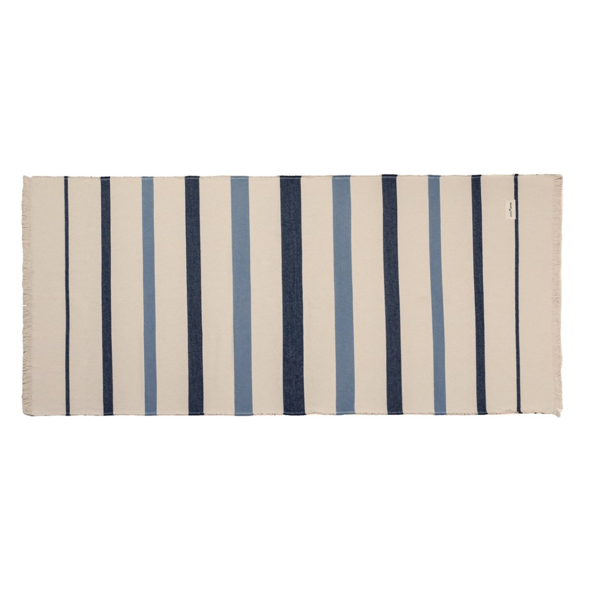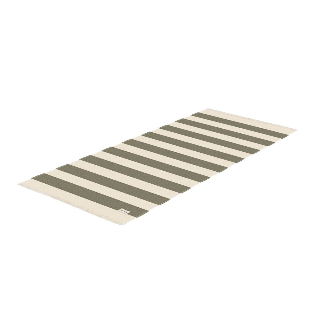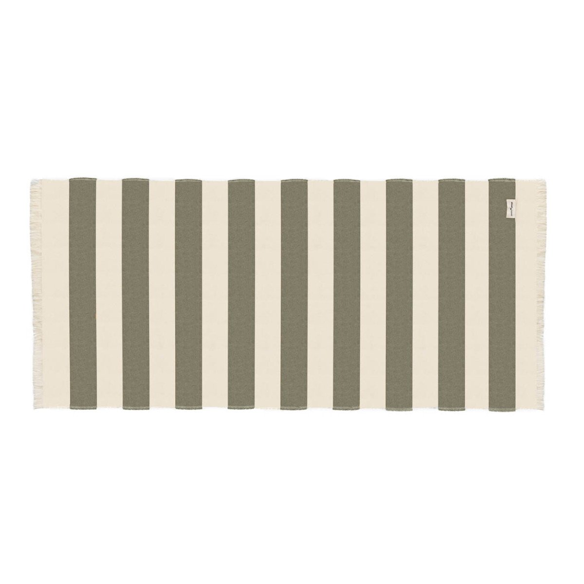 Lona rústica tejida rayada, con flecos. Diseñada para enrollarse con su cinta y poder trasportarla fácilmente.