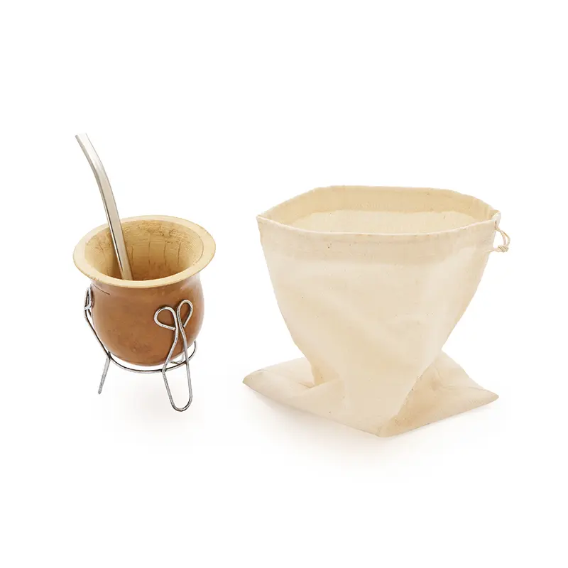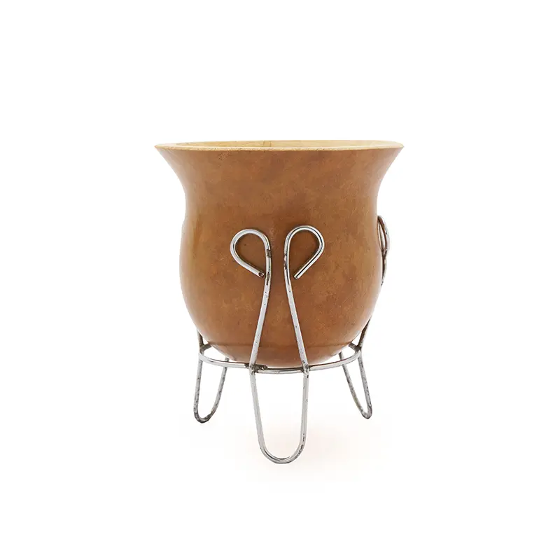 Mate de calabaza natural dedicadamente seleccionada y pulida, montada sobre un pie de acero niquelado. Su base metálica eleva y estabiliza el mate, aportando un toque distintivo ideal tanto para uso diario como para presentaciones corporativas. Incluye bombilla de acero inoxidable con resorte y una bolsa de algodón de 20 x 20cm.