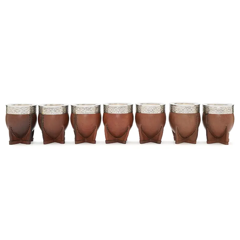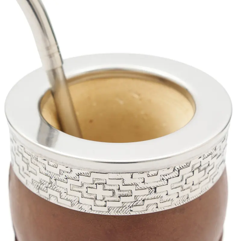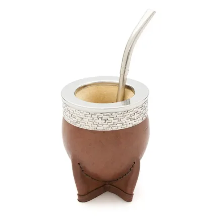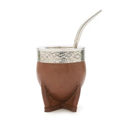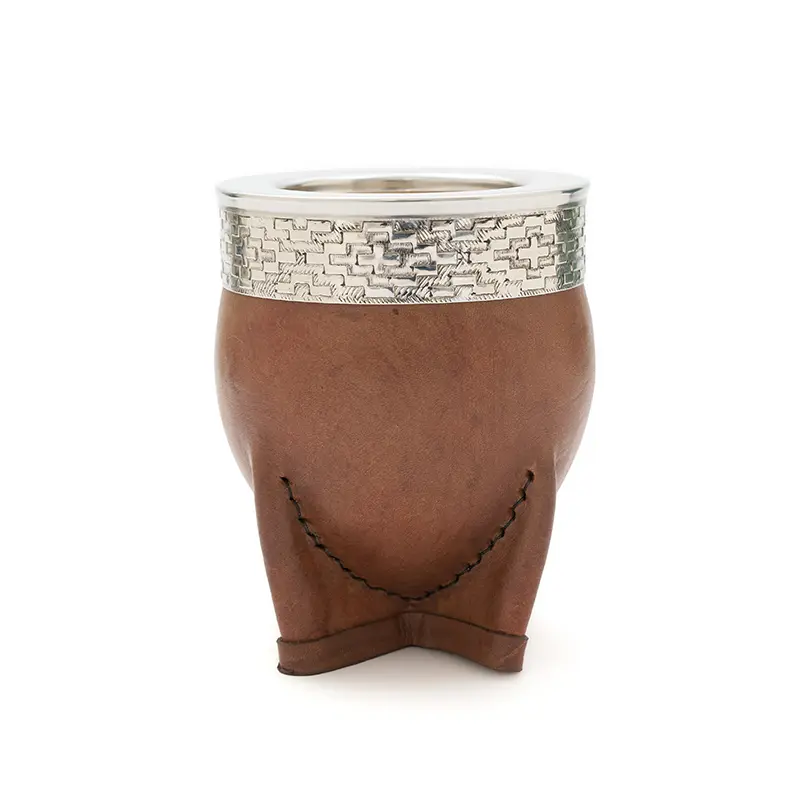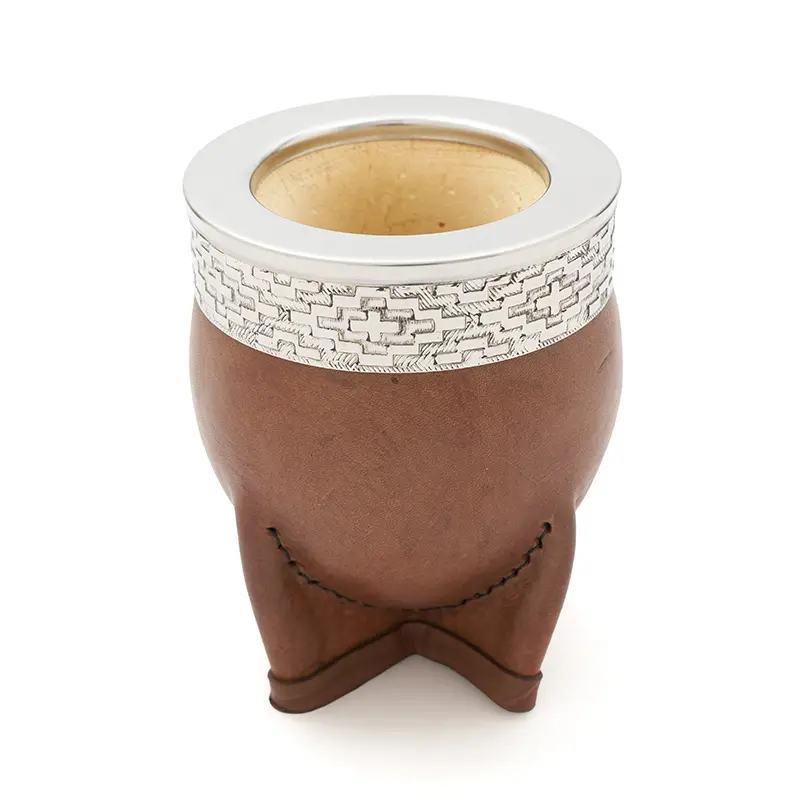 Mate de calabaza tipo imperial modelado en cuero vaqueta vacuno, cuenta con virola superior de acero inoxidable pulido espejo con un diseño de guarda pampa grabado. Ideal para uso diario, regalos corporativos o como producto destacado en tiendas especializadas. Incluye bombilla pico de loro y una bolsa de algodón de 20 x 20cm.