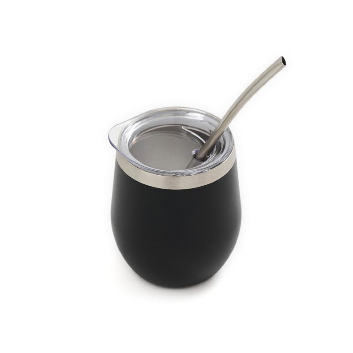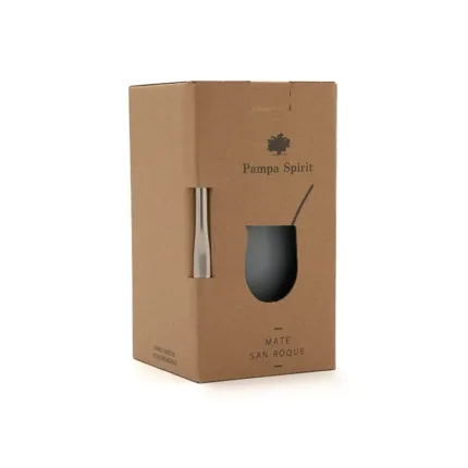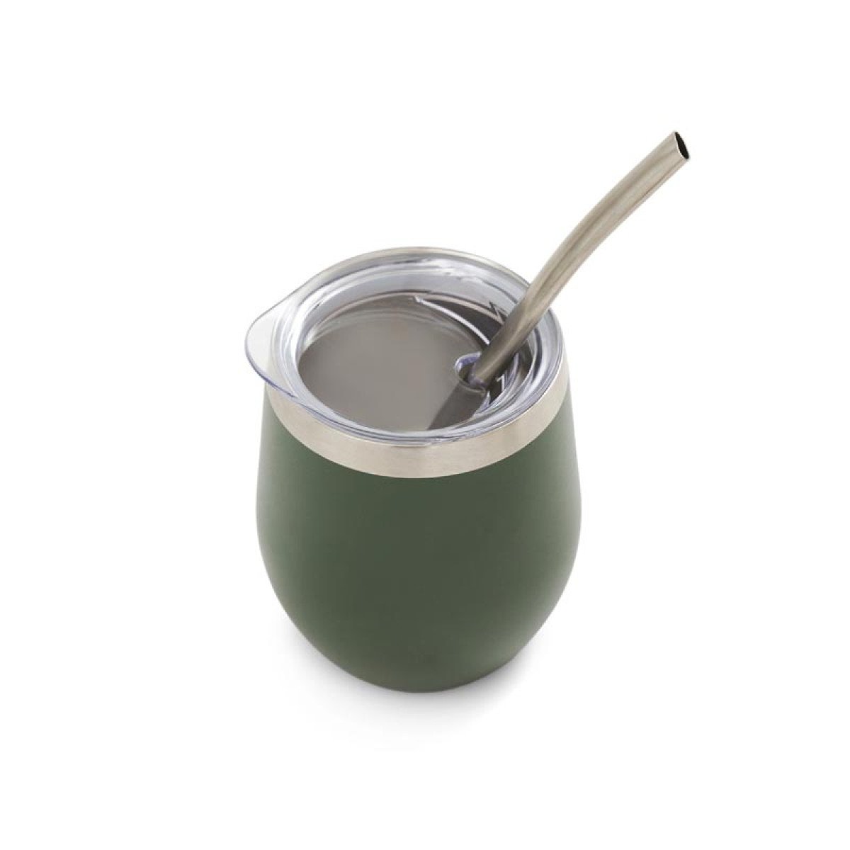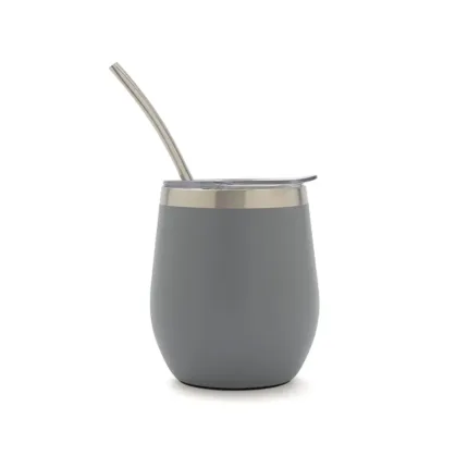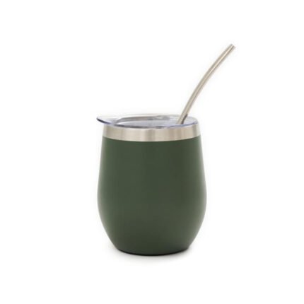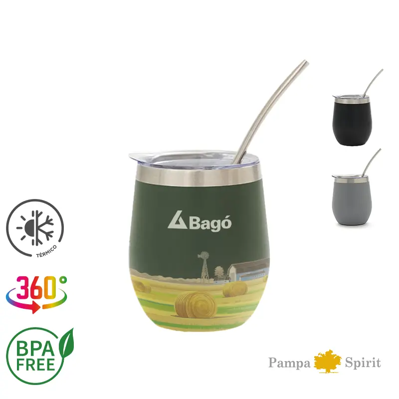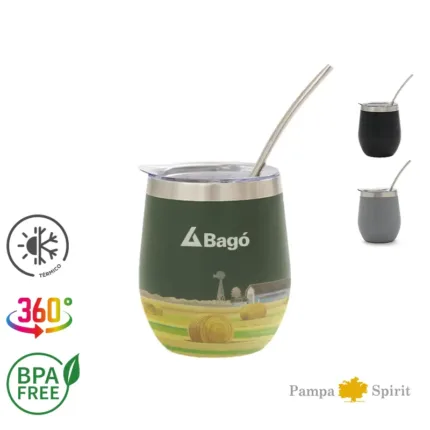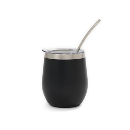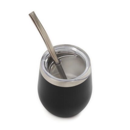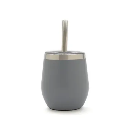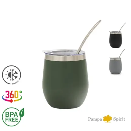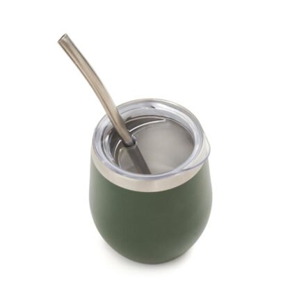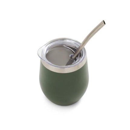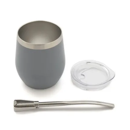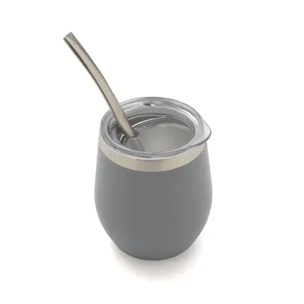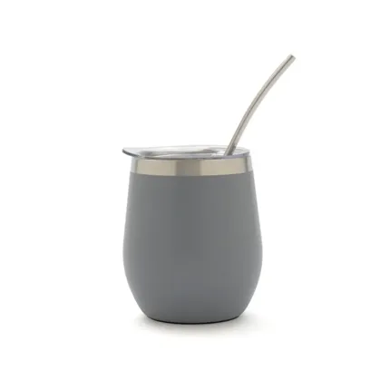 Mate confeccionado en doble pared de acero inoxidable 304. Cuenta con tapa antiderrame y bombilla de acero. Capacidad: 220 ml.