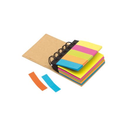 7,5 x 2 x 7 cm Cartón. Material reciclado. 5 blocs de 25 notas adhesivas rectangulares grandes. 5 blocs de 25 notas adhesivas rectangulares chicas estilo banderitas. Anillado metálico.