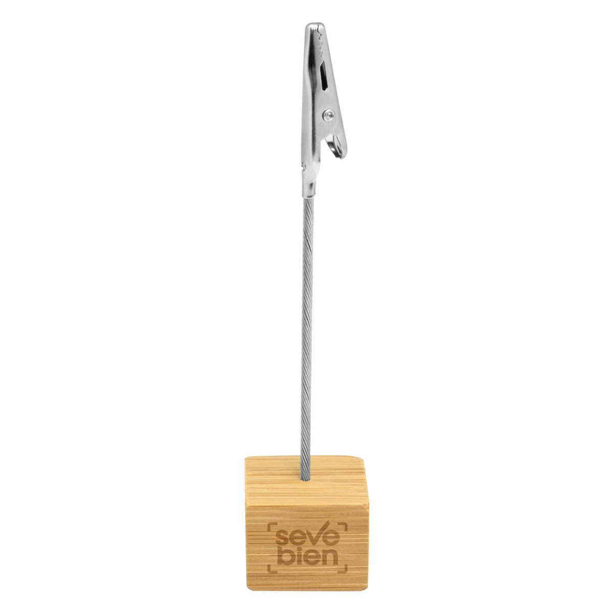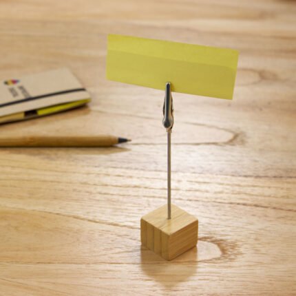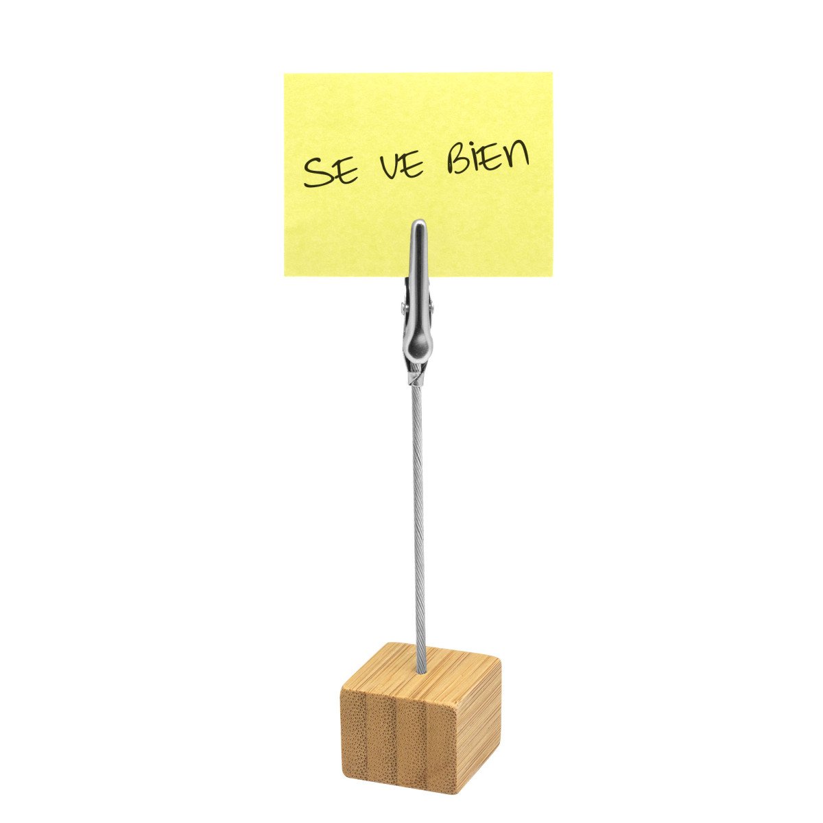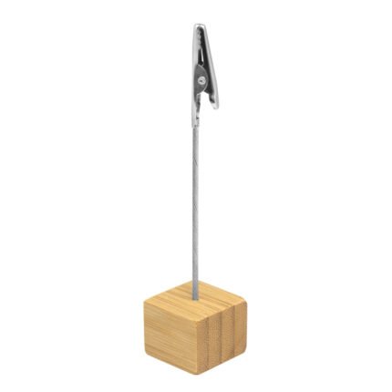 2,5 x 2,5 x 2,5 cm. Alto 11,5 cm Bambú y metal. Memo clip de escritorio con base cúbica en bambú. Broche pinza cocodrilo de metal. Práctico, útil y transportable.