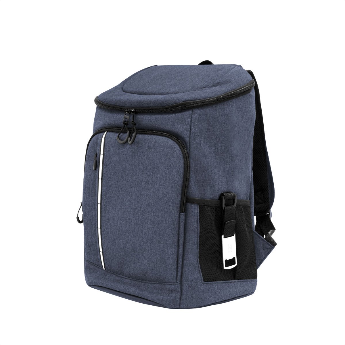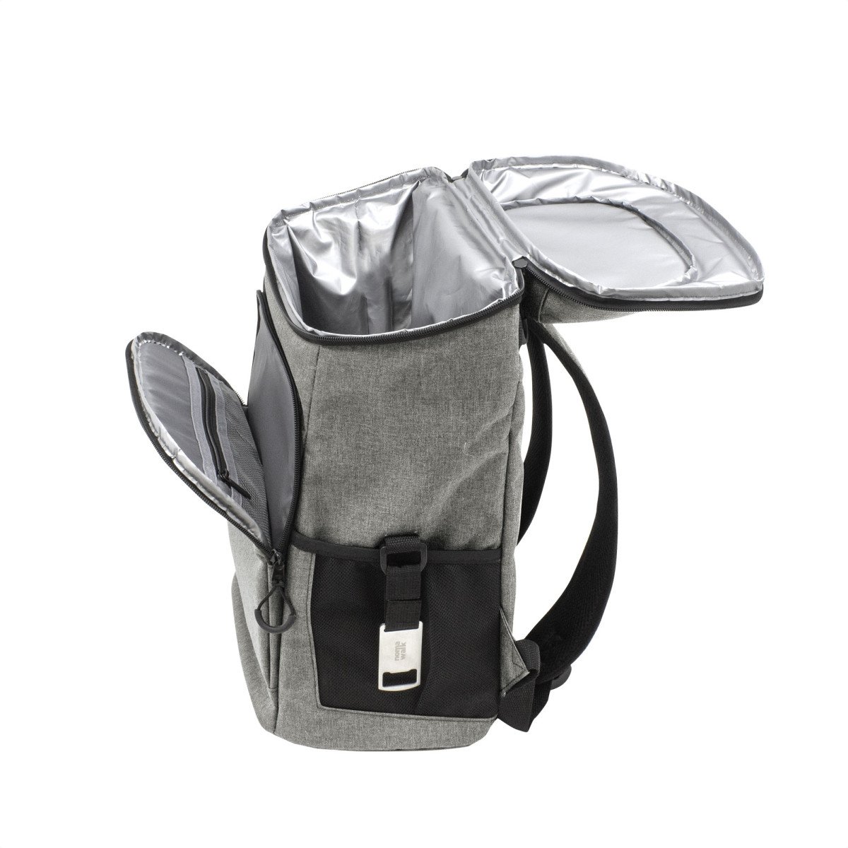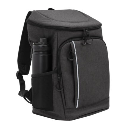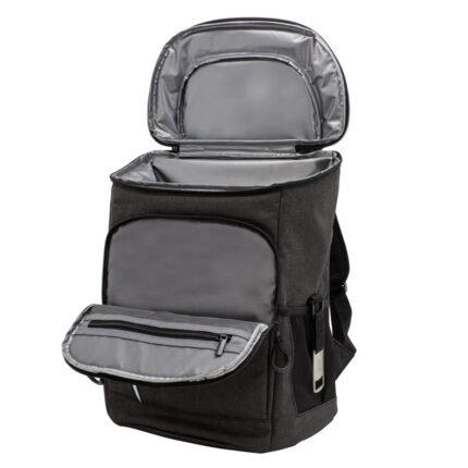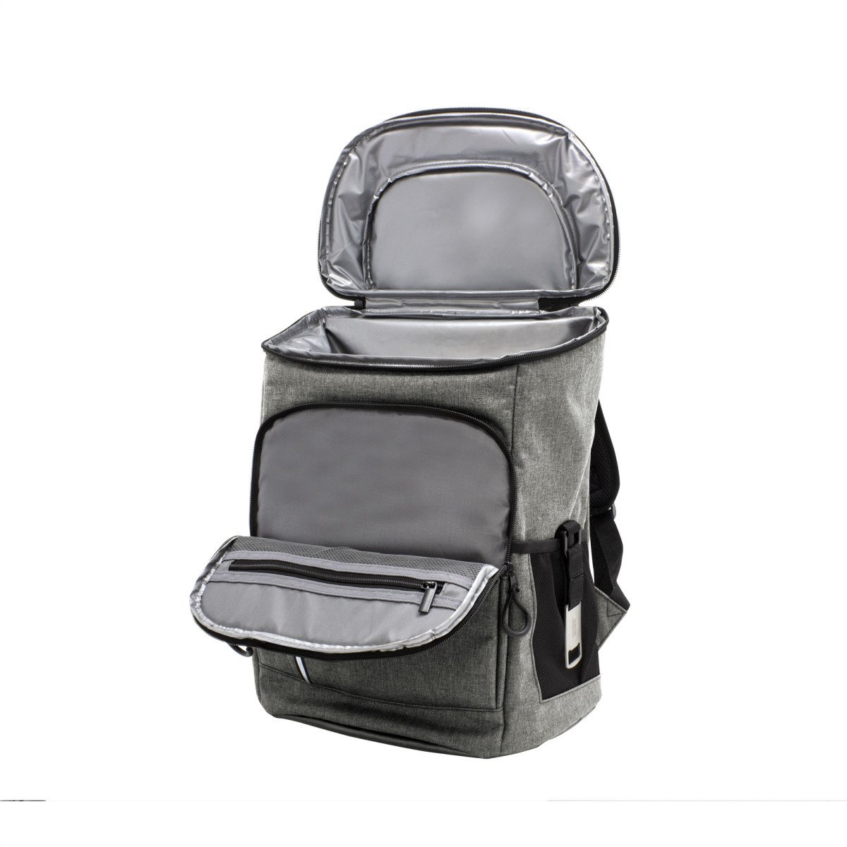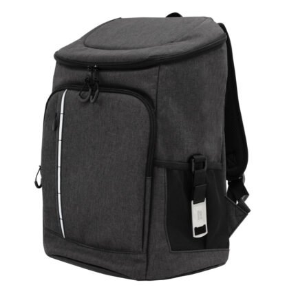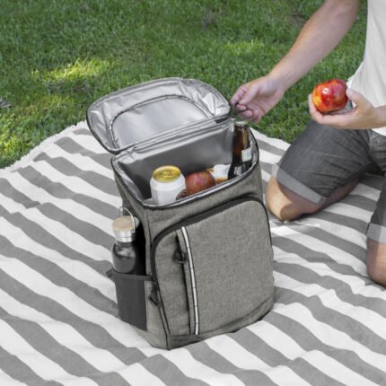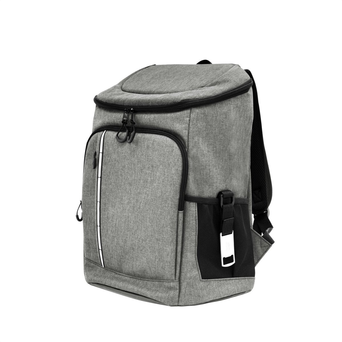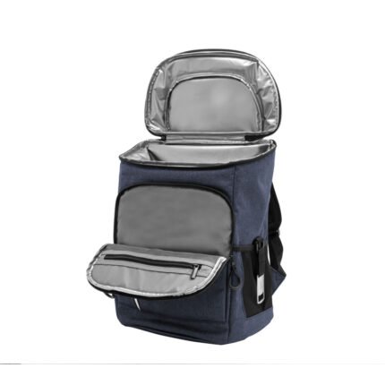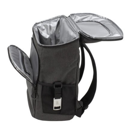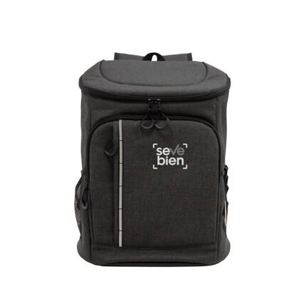 29 x 43 x 18 cm. Capacidad 18 litros aprox. Poliéster Wulong 300D + Interior forrado en PEVA color plata con relleno de espuma de PE. Mochila cooler. Compartimento principal con cierre en la parte superior. Compartimento frontal con cierre, bolsillo interno de red con cierre y bolsillo externo vertical con cierre y banda reflectante. Dos bolsillos laterales de red multipropósito. Incluye abridor de botellas de acero inoxidable (6,3 x 3,3 cm) extraíble. Correas regulables acolchadas. Cierres metálicos. Tiradores de cierre plásticos en forma de U de color negro.