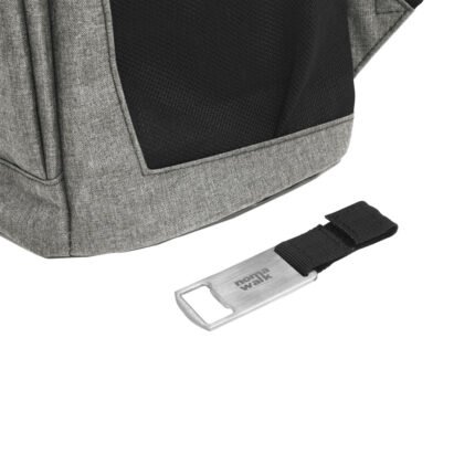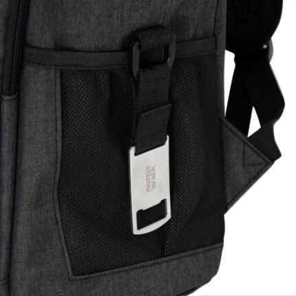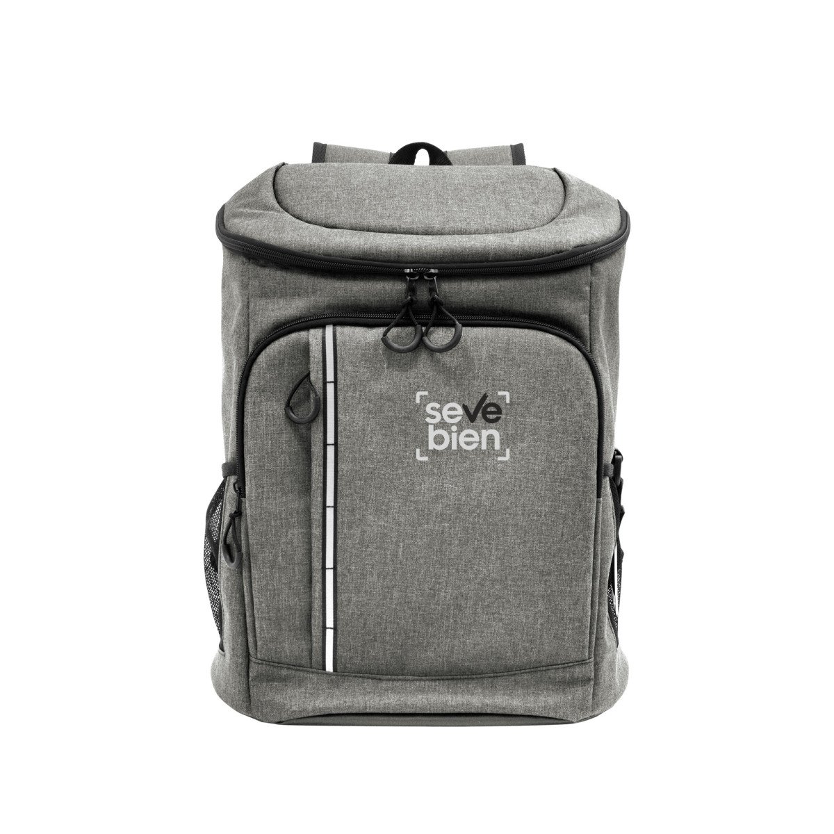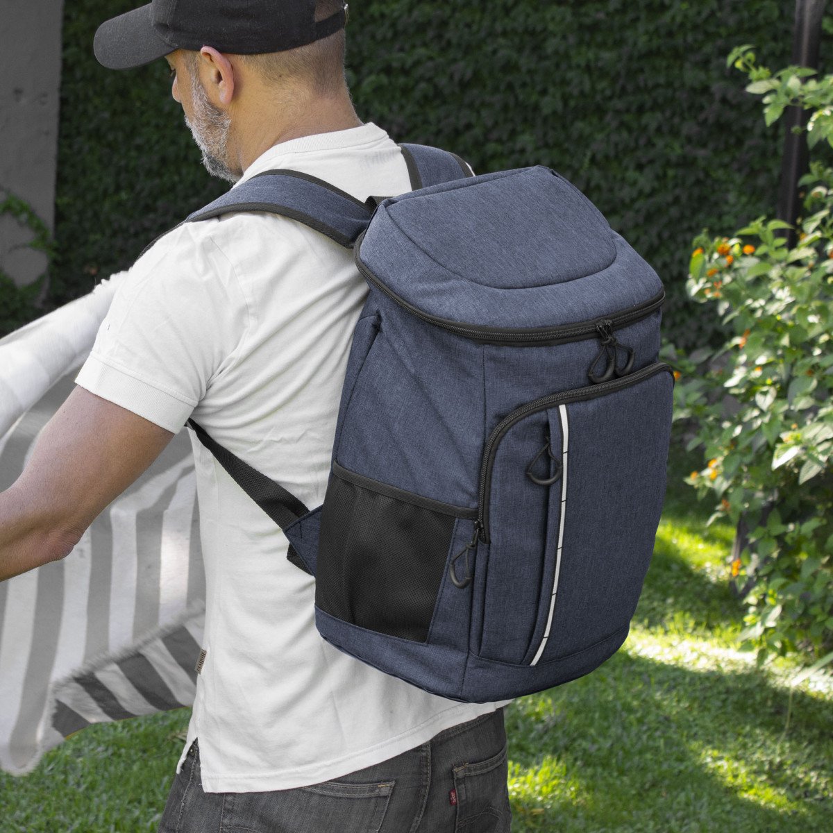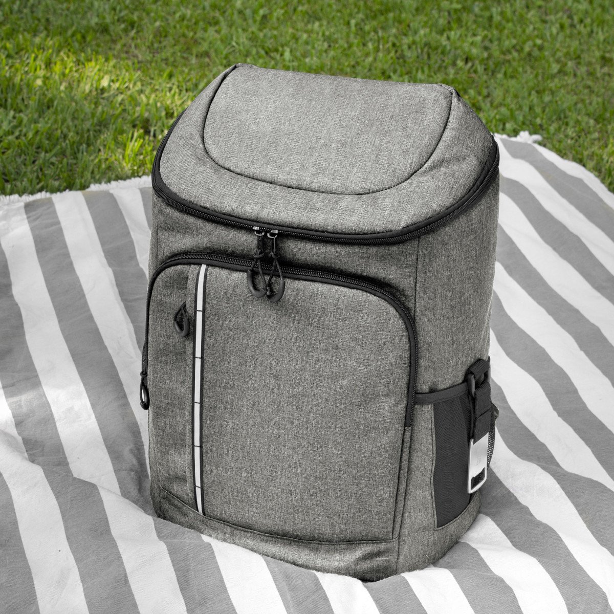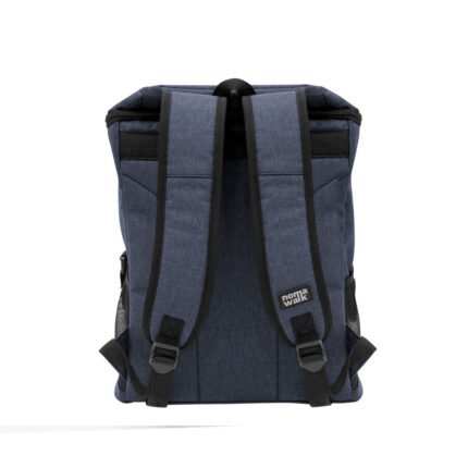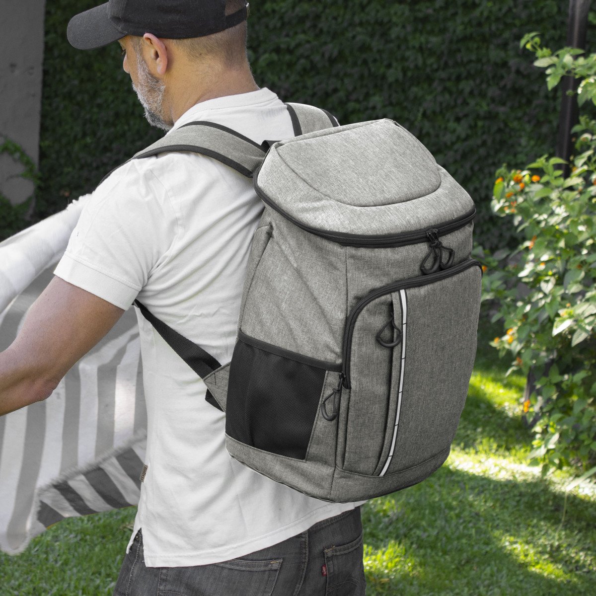 29 x 43 x 18 cm. Capacidad 18 litros aprox. Poliéster Wulong 300D + Interior forrado en PEVA color plata con relleno de espuma de PE. Mochila cooler. Compartimento principal con cierre en la parte superior. Compartimento frontal con cierre, bolsillo interno de red con cierre y bolsillo externo vertical con cierre y banda reflectante. Dos bolsillos laterales de red multipropósito. Incluye abridor de botellas de acero inoxidable (6,3 x 3,3 cm) extraíble. Correas regulables acolchadas. Cierres metálicos. Tiradores de cierre plásticos en forma de U de color negro.