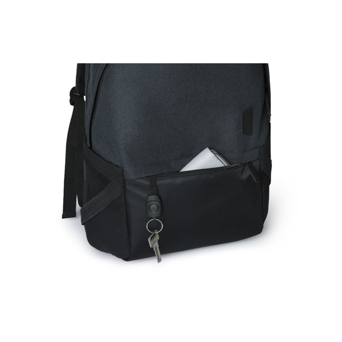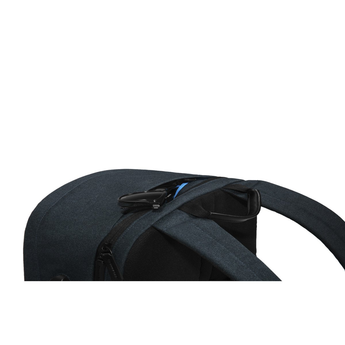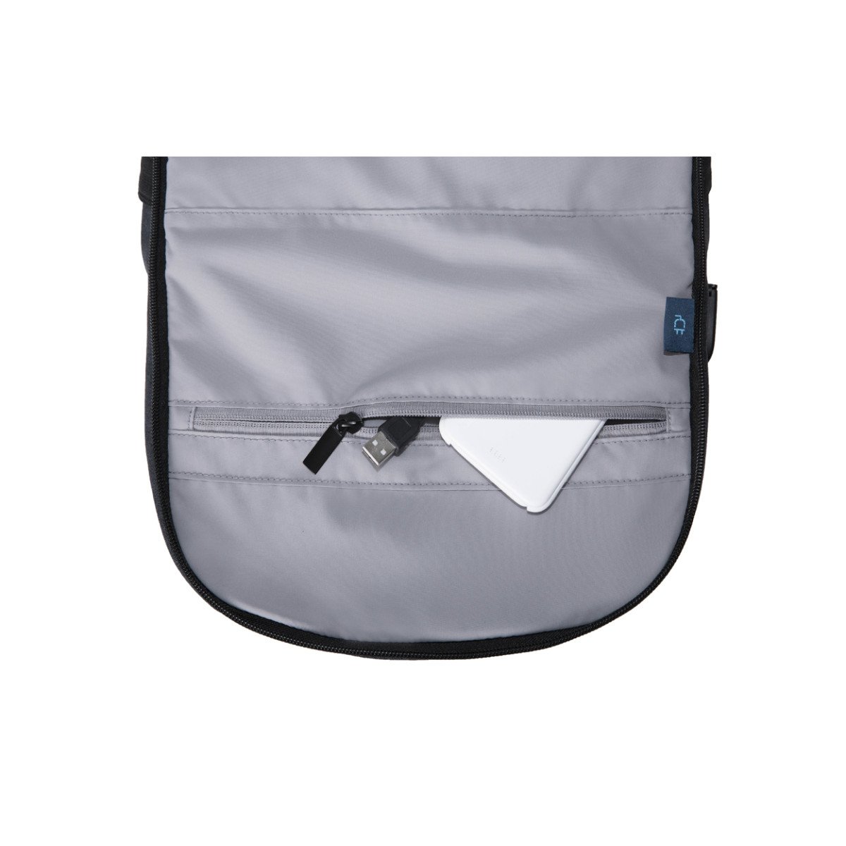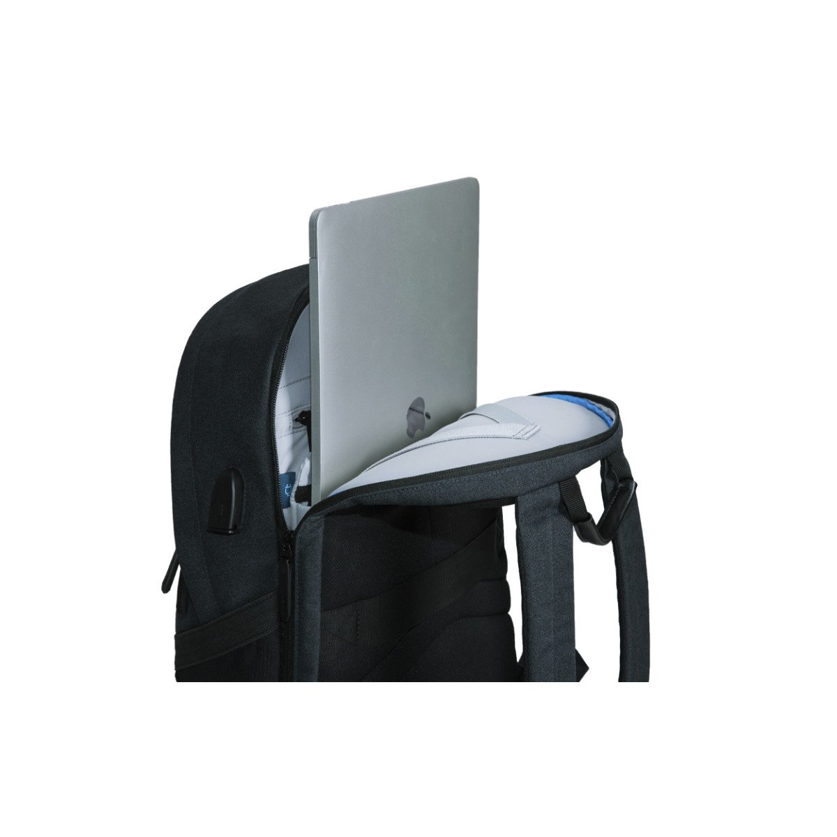 Políester 300D resistente al agua. + RPET (material reciclable), combina el color nego y azul oscuro. Múltiples compartimentos, incluye espacio porta notebook hasta 15.6″ Compartimiento especial RFID, impide que ciertas ondas electromagnéticas puedan penetrar en las tarjetas de crédito/débito que guardamos dentro dentro del mismo. Correa trasera para enganchar a la valija. E-zone es un compartimiento especialmente diseñado para proteger la notebook y accesorios digitales, cuenta con espuma EVA que protege en caso de caída. Capacidad 20L