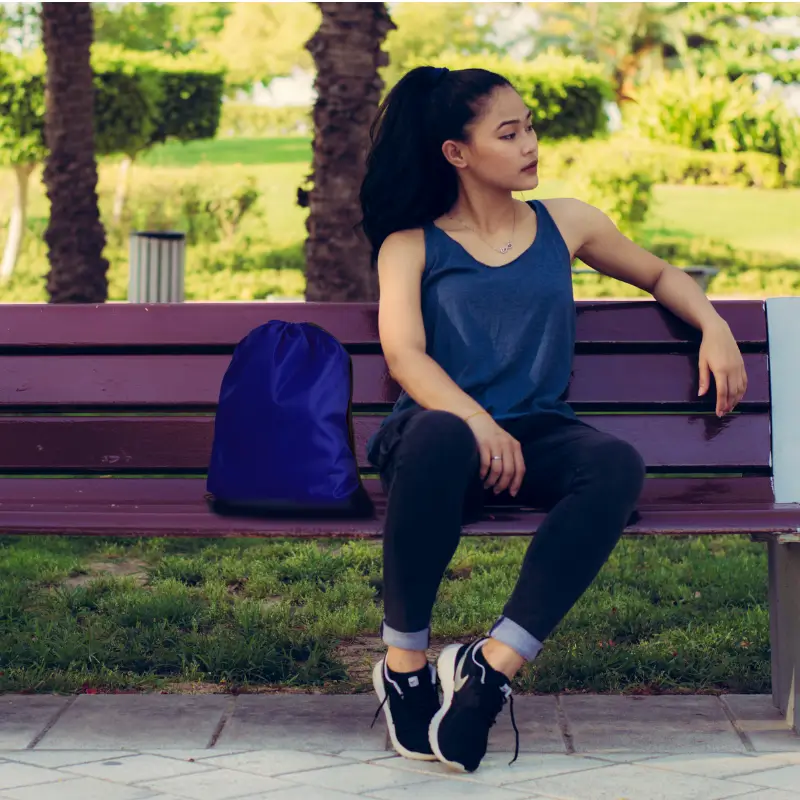 Mochila de Polyester. Cierre y correas de cordón. Ojales metálicos. Capacidad: 3,8 Lts. Medidas: 34,5 x 44,5 cm. Tahg.