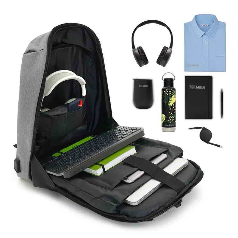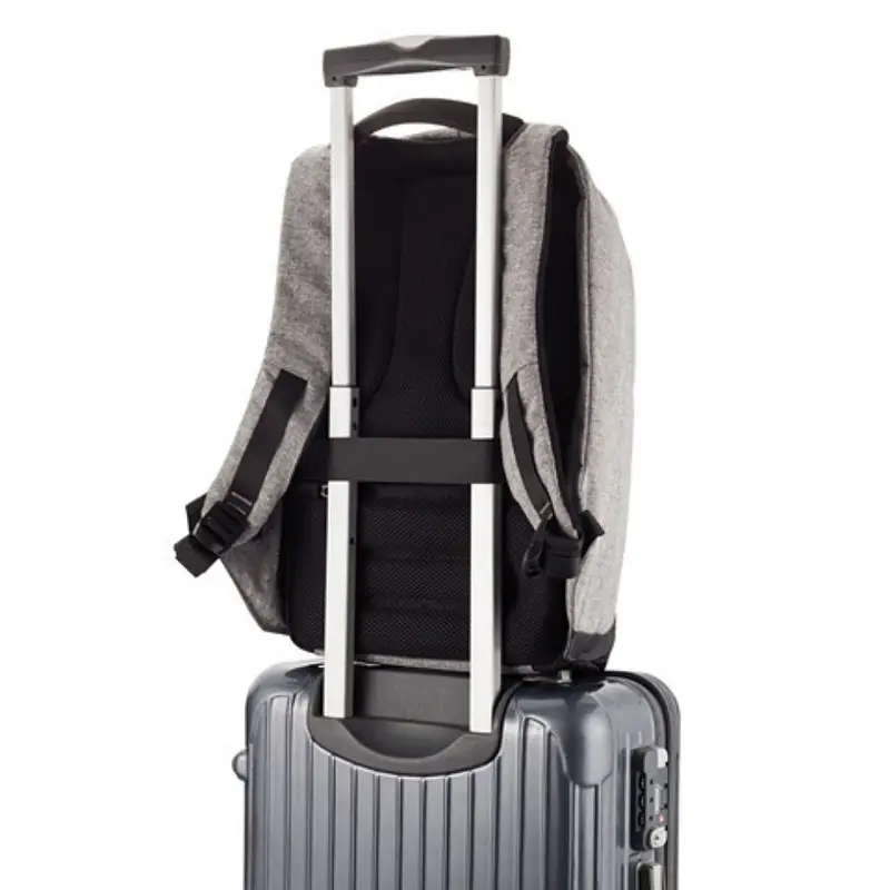 Mochila de Polyester Anti Robo con puerto USB. Compartimiento principal con gran capacidad Porta Tablet y Laptop. Bolsillo anti robo. Sujetador de carry on.