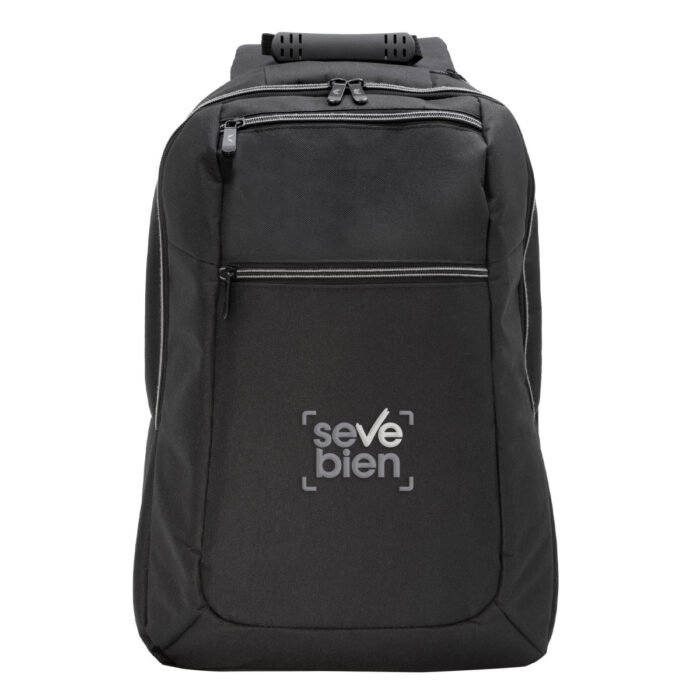 30 x 43 x 12 cm. Capacidad 14 litros. Poliéster 600D, interior poliéster 210D. Mochila portanotebook de 14 pulgadas. Compartimento lateral portanotebook, compartimento principal y 2 bolsillos frontales horizontales. Manija con refuerzo engomado, correas acolchadas, hebillas plásticas y cierres metálicos. Espalda acolchada. Tira para sujetar la mochila en la manija extensible de un equipaje de mano.