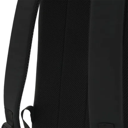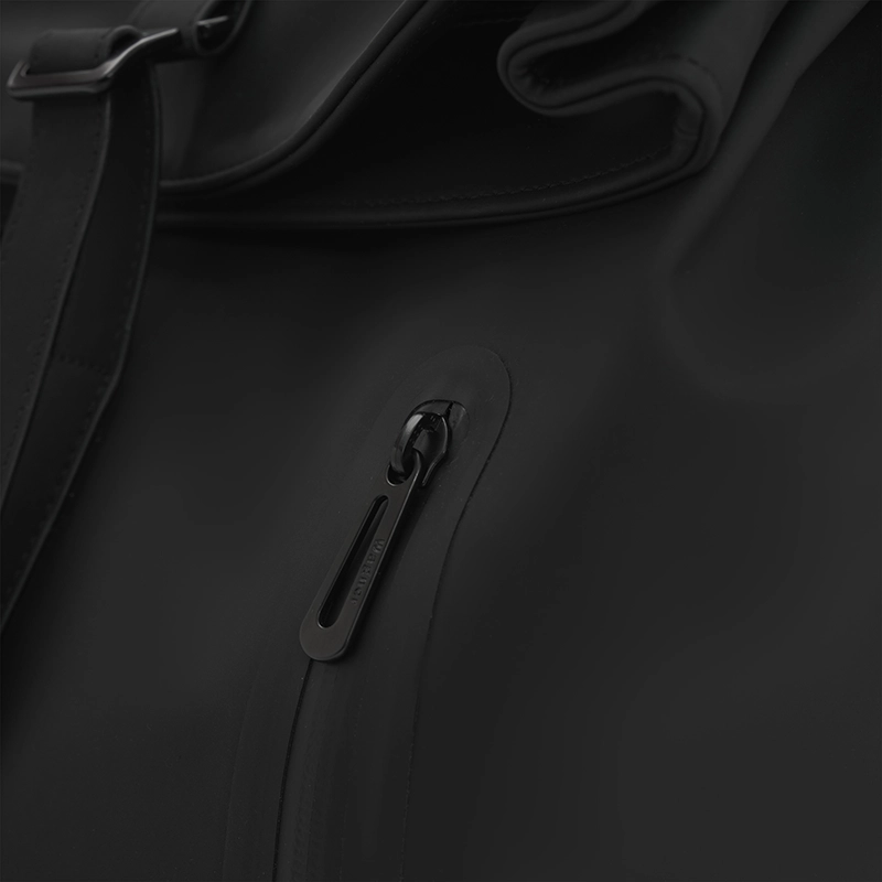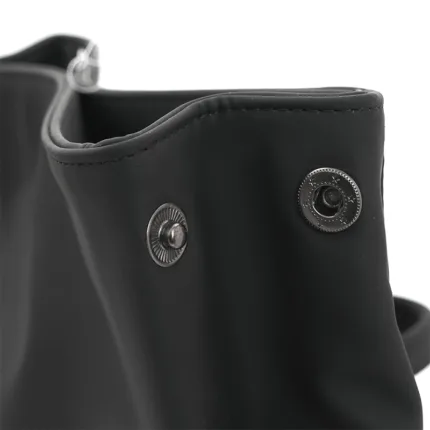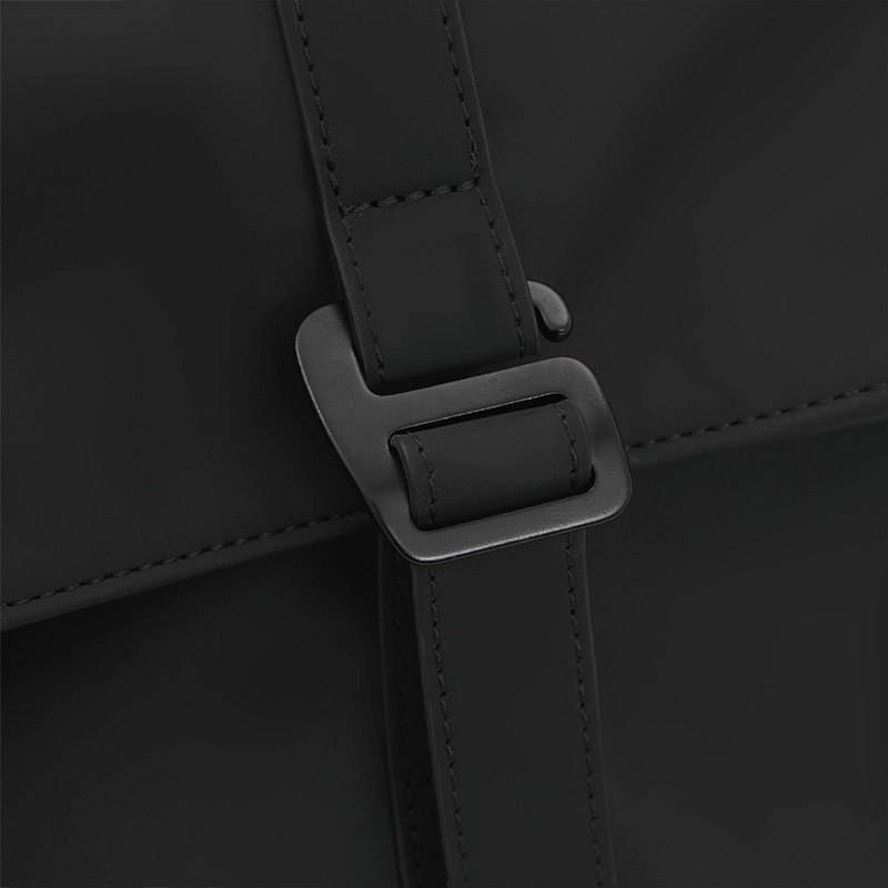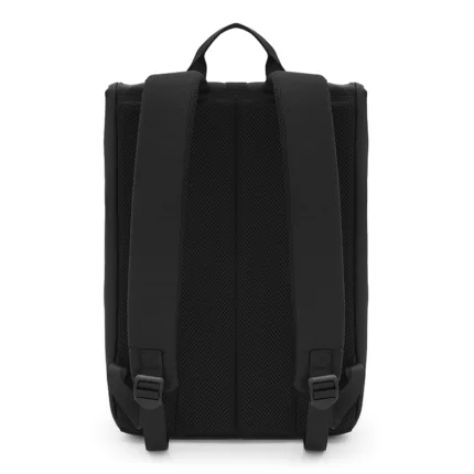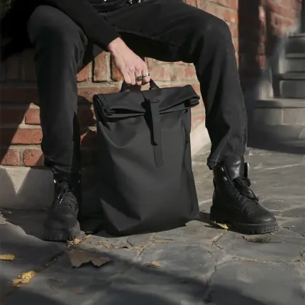Mochila con cierre enrollable y acceso frontal confeccionada en PU. Cuenta con apertura superior con tira y hebilla metálica, bolsillo con cierre al frente, espalda acolchada y correas ajustables. En su interior cuenta con un espacio para PC y dos bolsillos pequeños sin cierre. Incluye manija superior y diseño compacto.