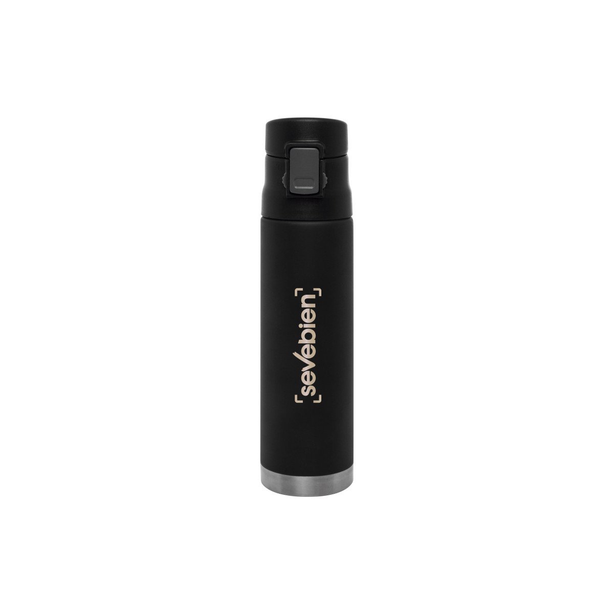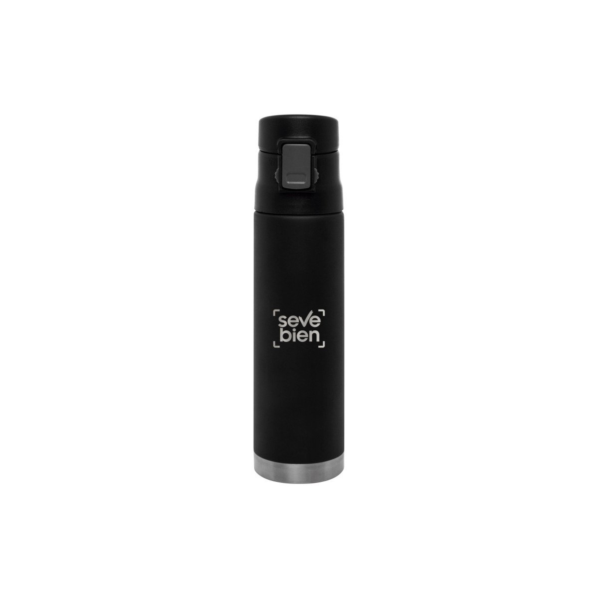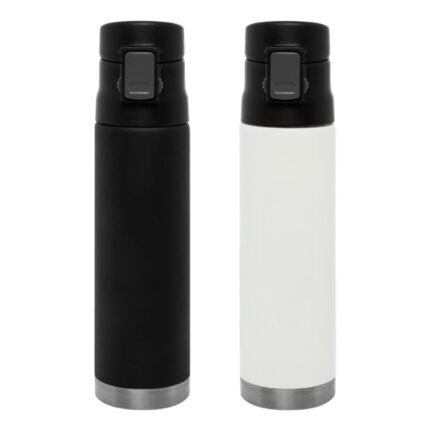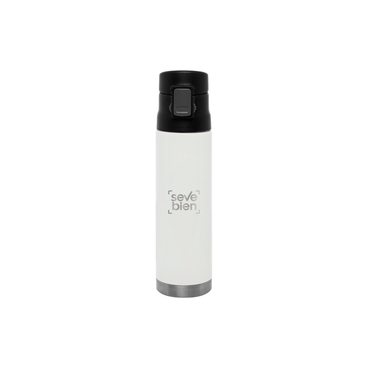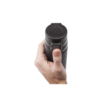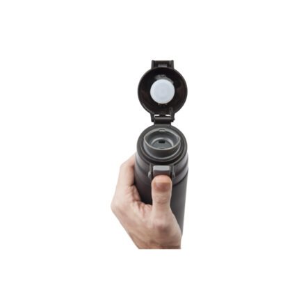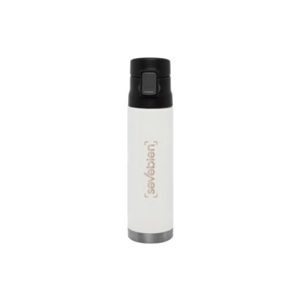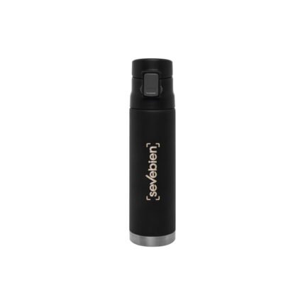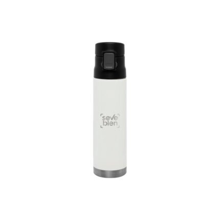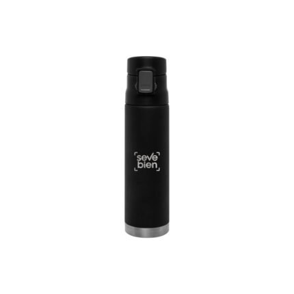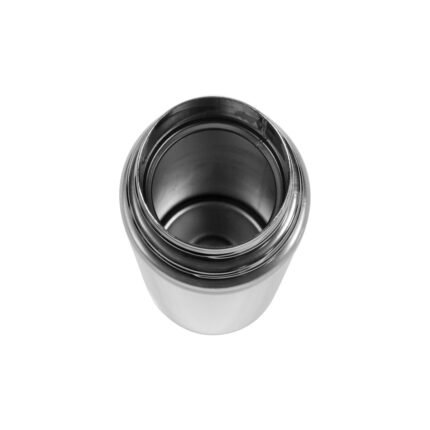 Ø 7 x 25,5 cm. Capacidad 500 ml. Acero inoxidable. Mug doble pared, sin tratamiento de vacío. Interior de acero 304 y exterior de acero 201. Tapa plástica con botón a presión de apertura. Traba de seguridad. Mantiene las bebidas frías y calientes por más tiempo. Presentación en caja de regalo.