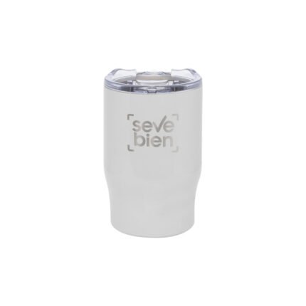 Ø 8,5 x 13,3 cm. Capacidad 350 ml. Acero inoxidable. Mug doble pared, sin tratamiento de vacío. Interior de acero 304 y exterior de acero 201. Tapa plástica transparente a presión con anillo de silicona. Mantienen las bebidas frías y calientes por más tiempo. No utilizar con bebidas gaseosas. Presentación en caja de regalo.