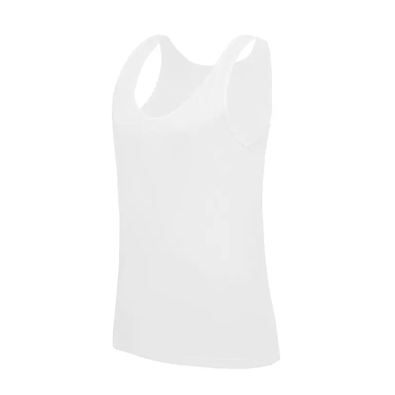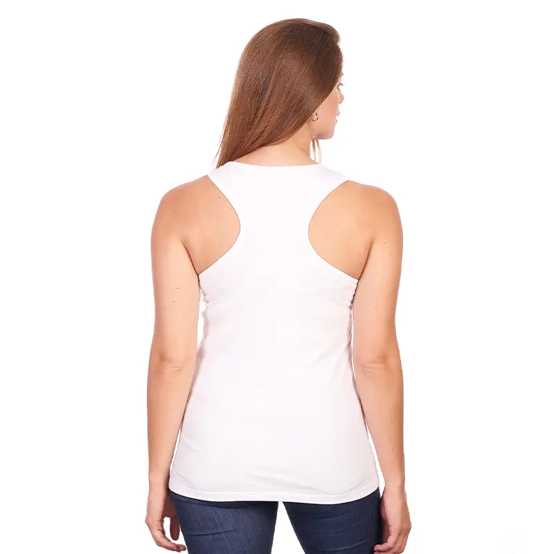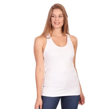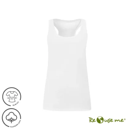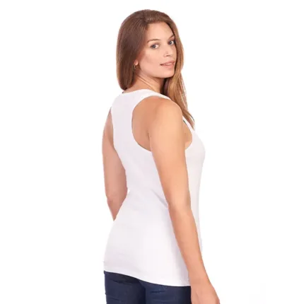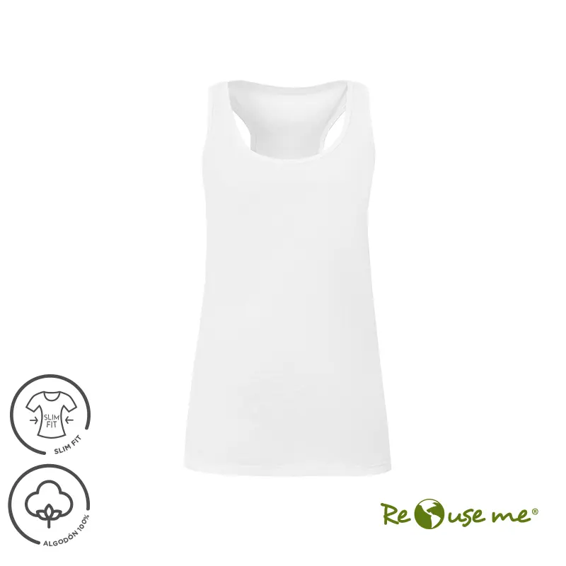 Remera musculosa de mujer en corte slim fit, con terminación de cuello y siza con collareta. Esta prenda está confeccionada 100% en algodón 24/1 peinado, un recurso ecológico renovable y sostenible.