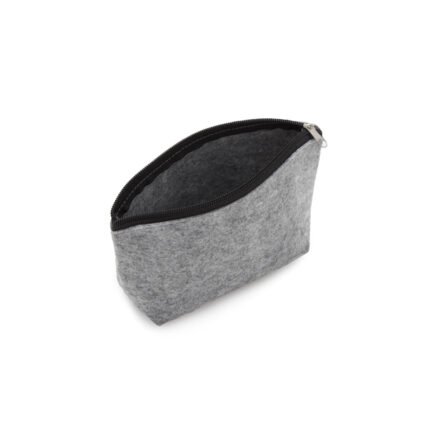 Neceser de fieltro RPET en color gris con detalles en negro, confeccionada a partir de botellas recicladas. Ideal para transportar los elementos de cuidado personal en viajes y bolsos de deporte.