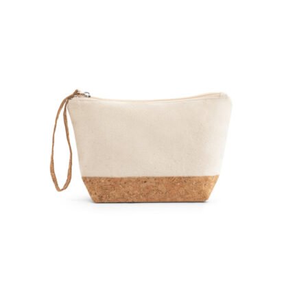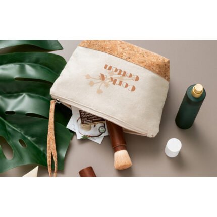 Necessaire 100% algodón (280 g/m²) con detalles de corcho en la parte inferior de la bolsa y asa con cierre, que también tiene función de asa para facilitar su transporte. Interior forrado, para facilitar la limpieza y de secado rápido, ideal para guardar los productos de maquillaje, viaje, etc.