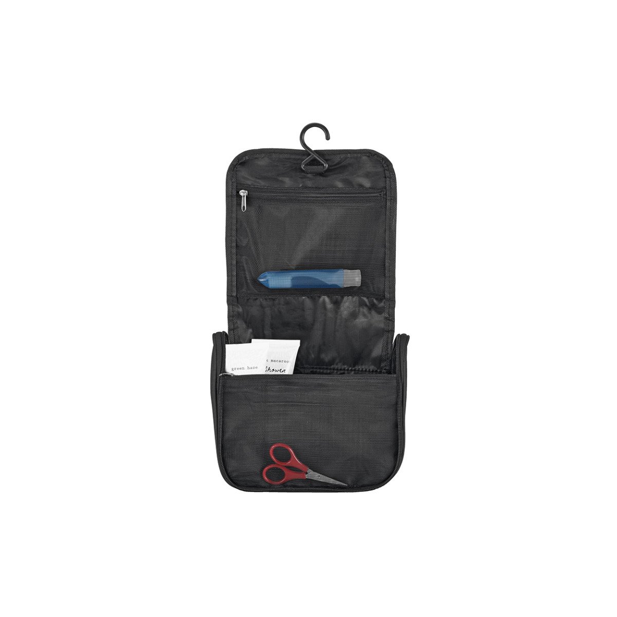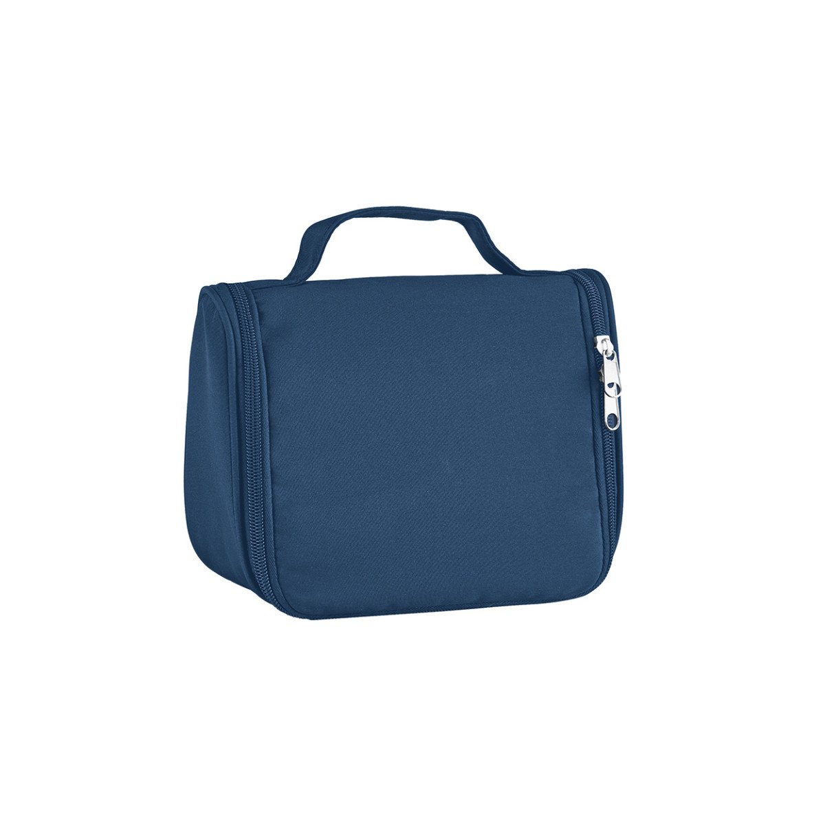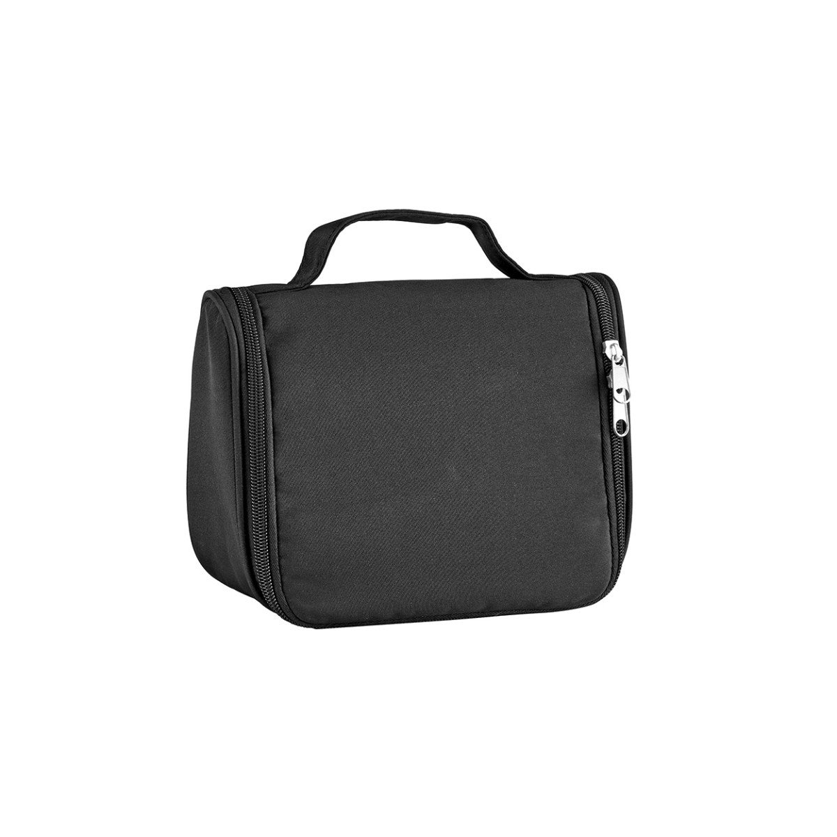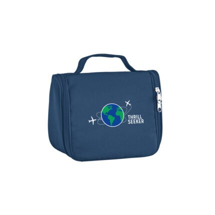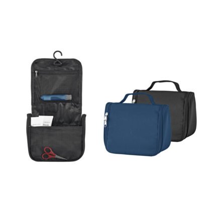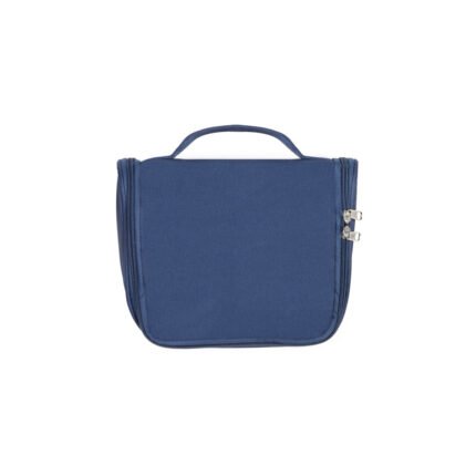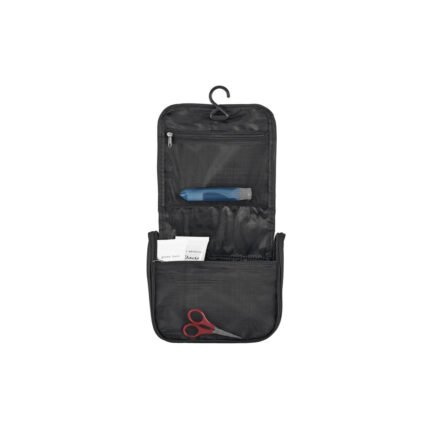 Necessaire de microfibra con compartimento principal, bolsillo de red y gancho para colgar. Cierre de apertura completa. Ideal para viajes.