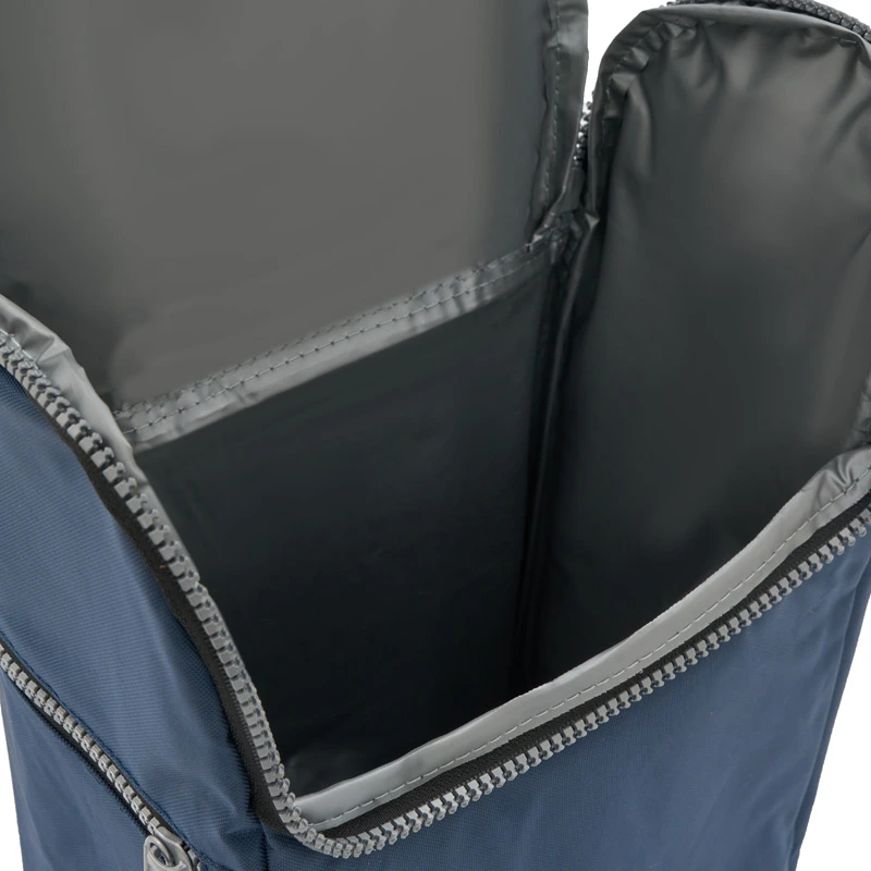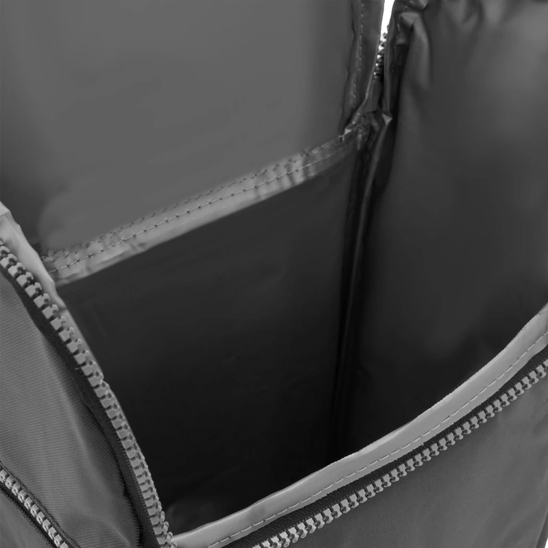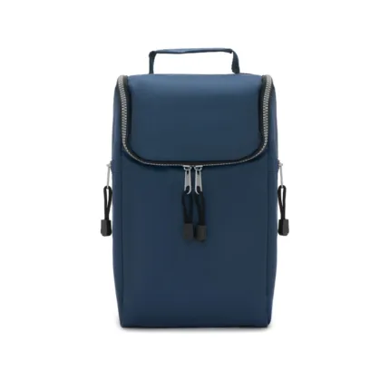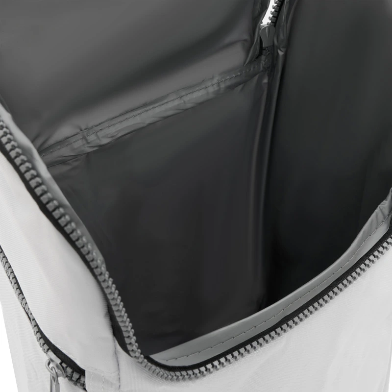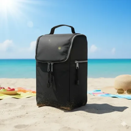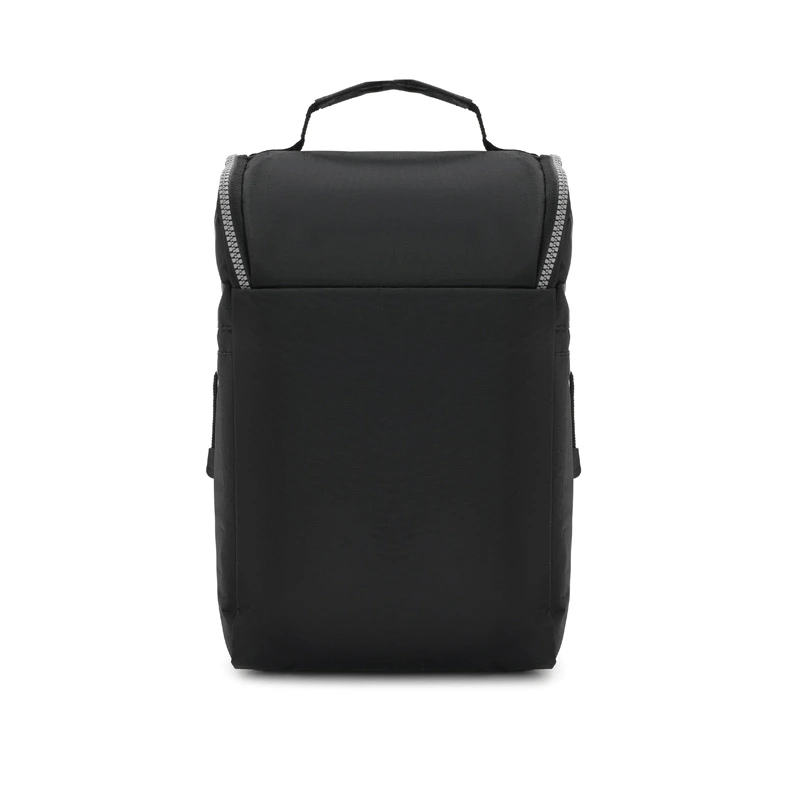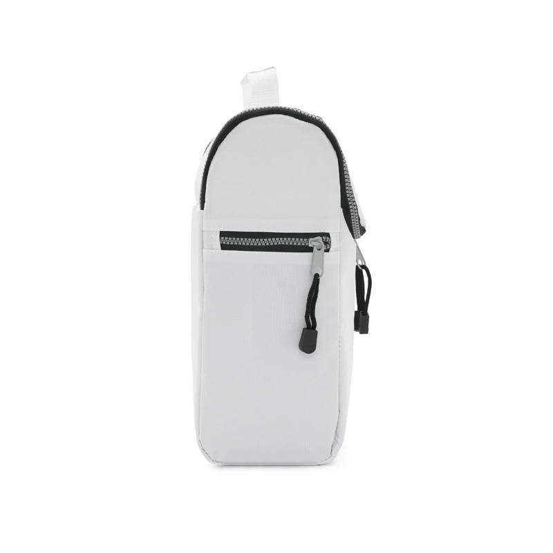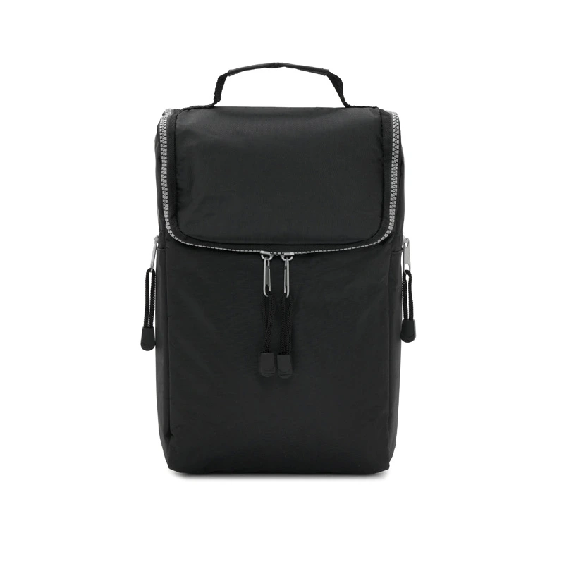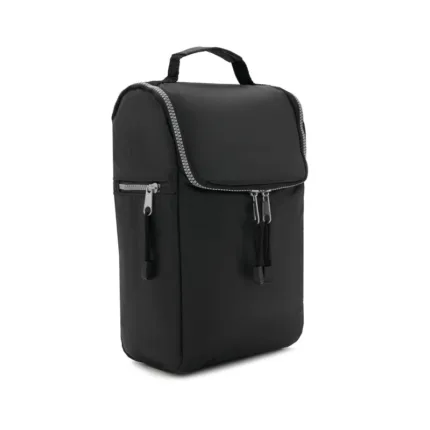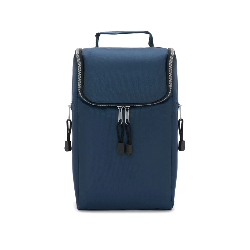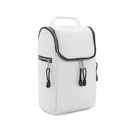 Cooler confeccionado en tela Nylon 600D, interior térmico forrado en PVC gris. Bolsillos laterales. Apto para llevar botellas, termos y otros. Colores: Negro, Blanco, Azul y Rojo. Medidas: 28 alto x 20 ancho x 14 base cm. Capacidad: 8 Lts.