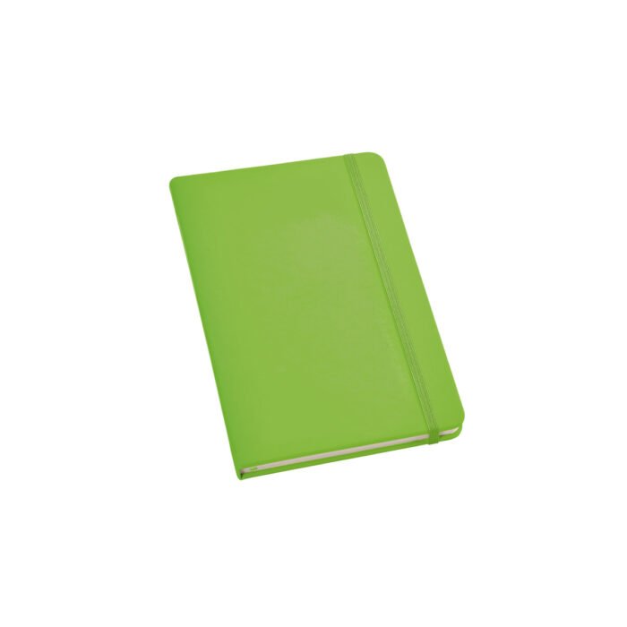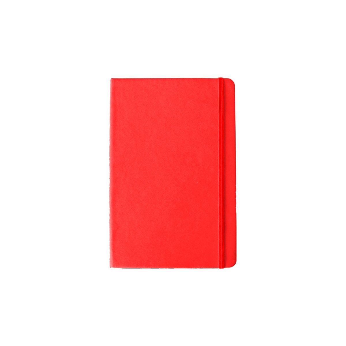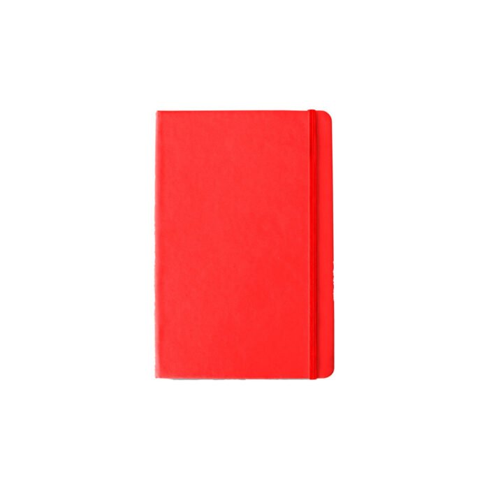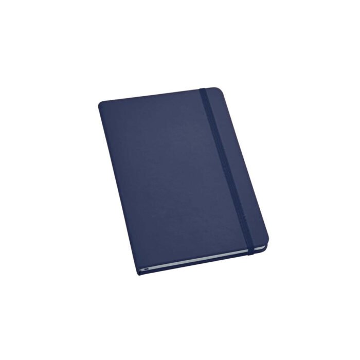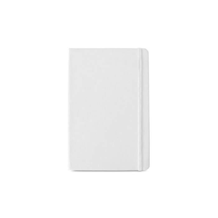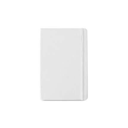 Cuaderno A5 con 80 hojas lisas, tapa dura PU, cinta marcapáginas y cierre elástico del mismo color.