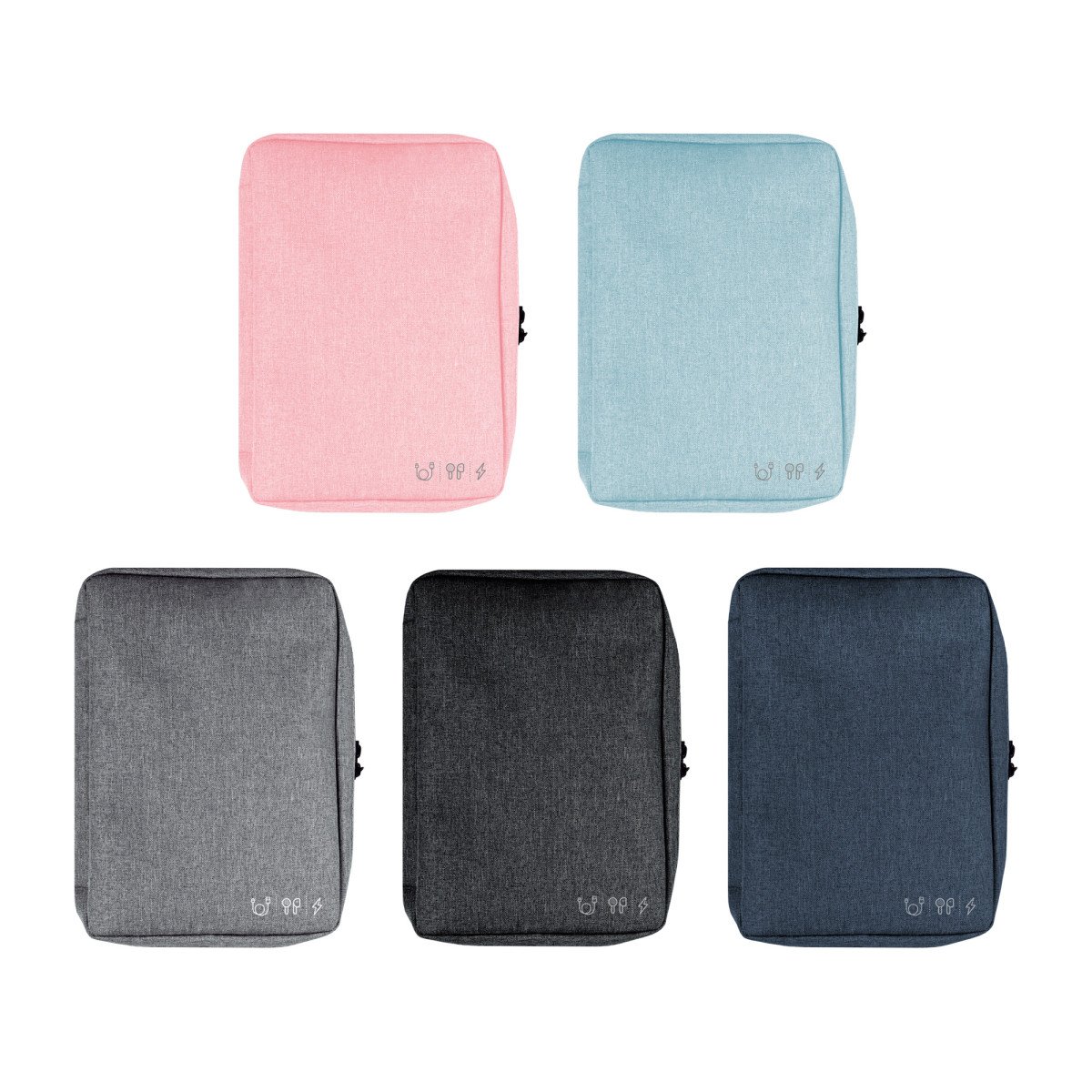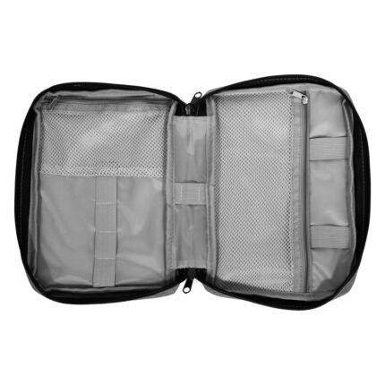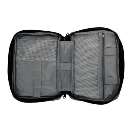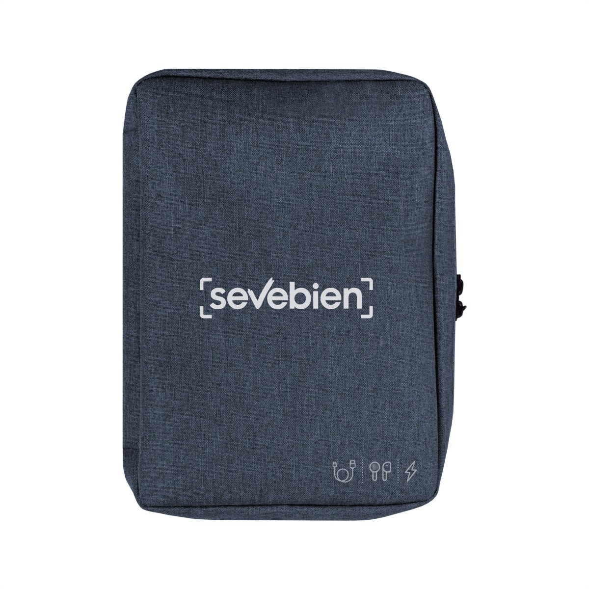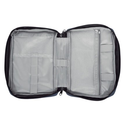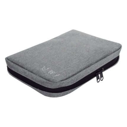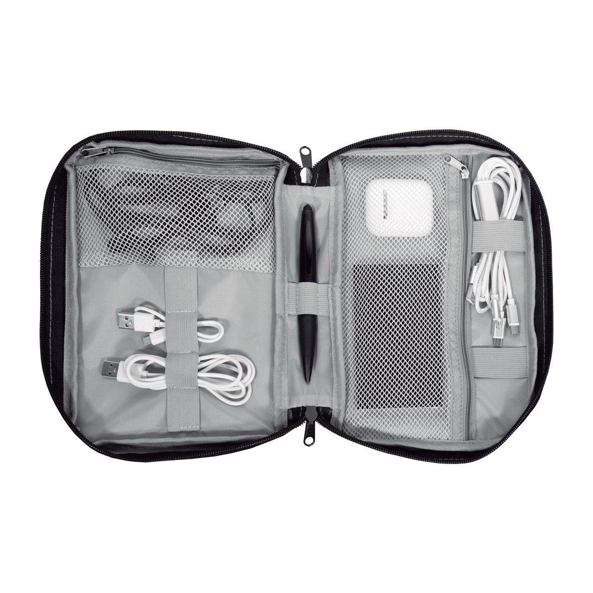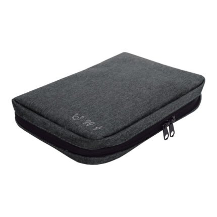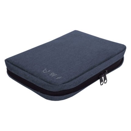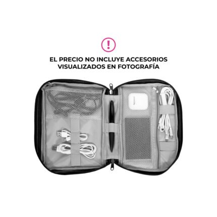 16,5 x 23 x 4 cm.Poliéster. Organizador para cables y accesorios. Cuenta con dos bolsillos de red con cierre. 4 elásticos que permiten enrollar y guardar los cables, 1 elástico porta bolígrafo y 2 elásticos amplios. NO INCLUYE ACCESORIOS.