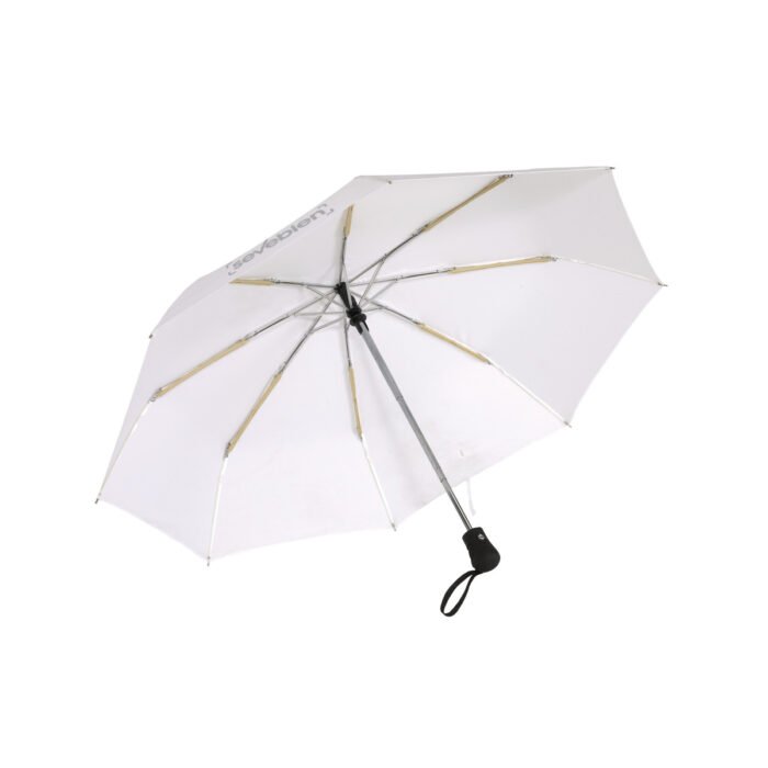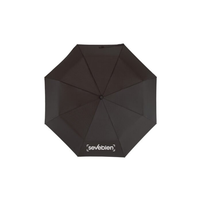 Ø 98 cm. 8 gajos. Ancho gajo 37 cm. Largo cerrado 28,5 cm. Largo abierto 55,5 cm. Poliéster Pongee con revestimiento especial hidrófugo, metal y plástico engomado. Paraguas APERTURA Y CIERRE AUTOMÁTICO. Eje y varillas metálicas. Mango de plástico engomado con correa cordón color negro. Botón a presión. Cierre con correa de velcro.