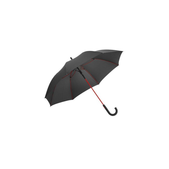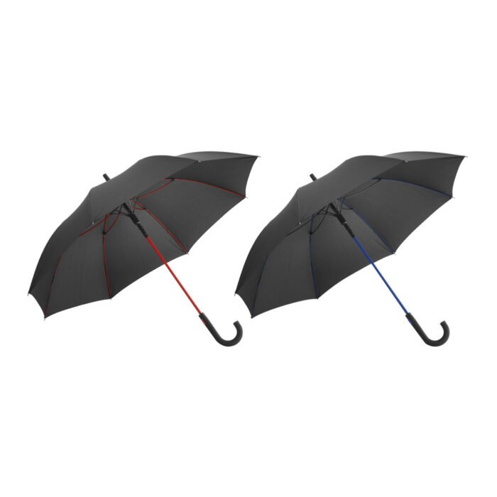 Paraguas de 8 gajos con estructura y varillas de fibra de vidrio de colores. Con mecanismo de apertura automática. Material: Poliéster.