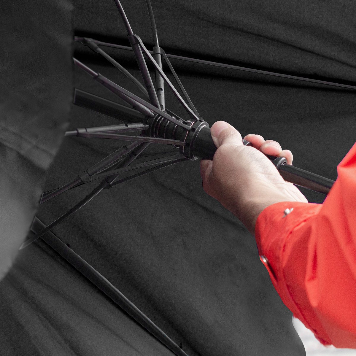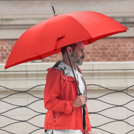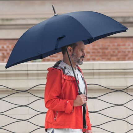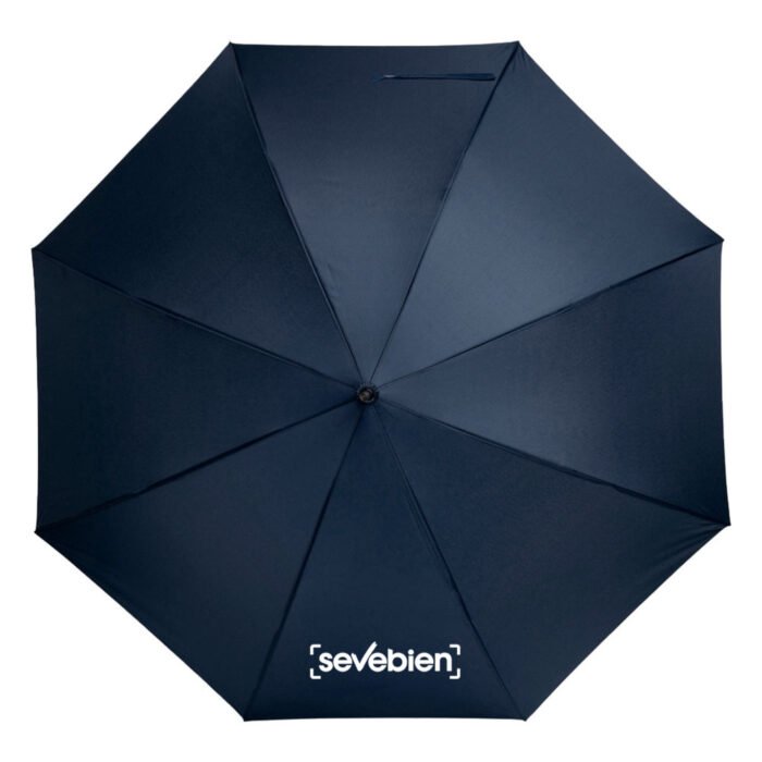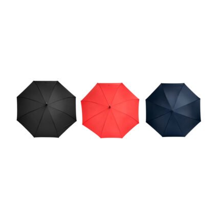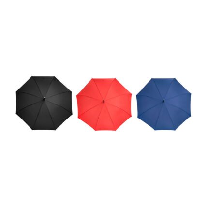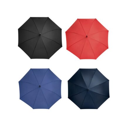Ø 120 cm. 8 gajos. Ancho gajo 45 cm. Largo total 93 cm. Poliéster pongee, metal y EVA. Paraguas APERTURA AUTOMÁTICA Y CIERRE MANUAL. Eje metálico, varillas en fibra de vidrio , punta niquelada, mango en EVA. Botón a presión. Cierre con correa de velcro.
