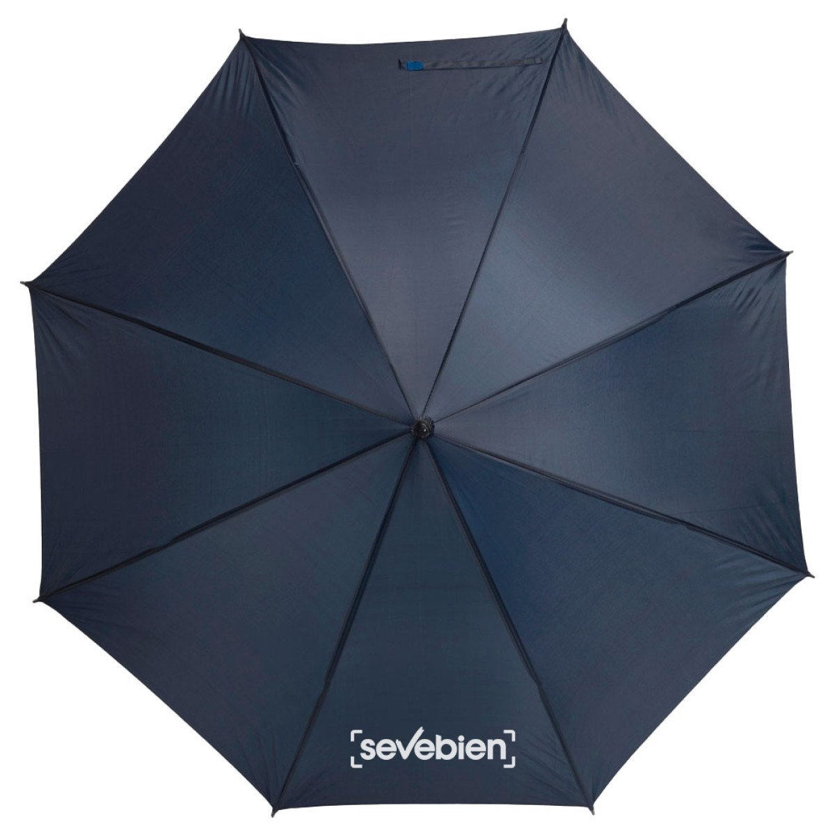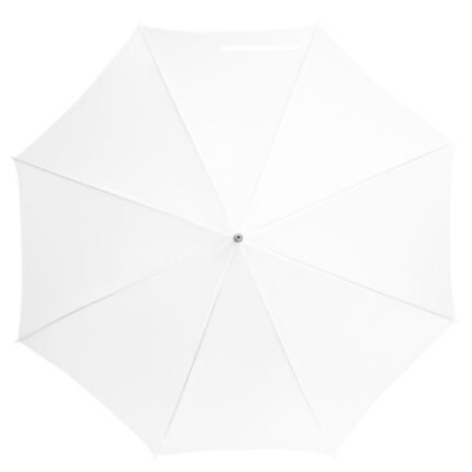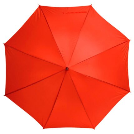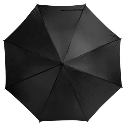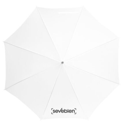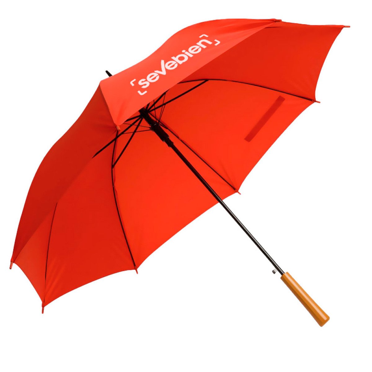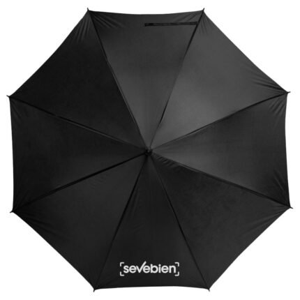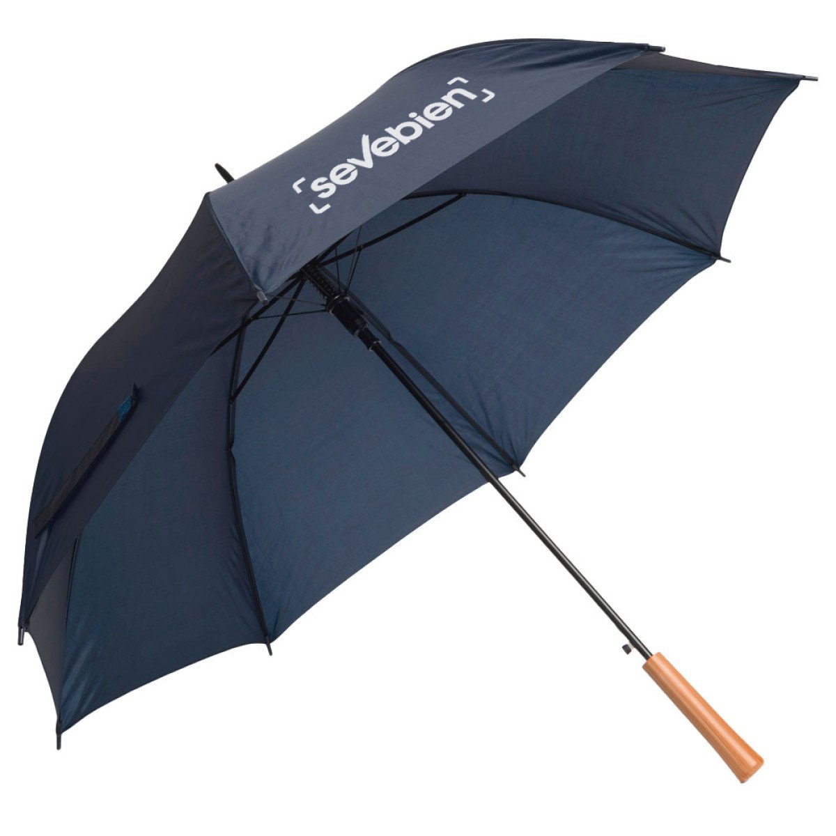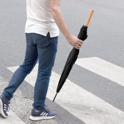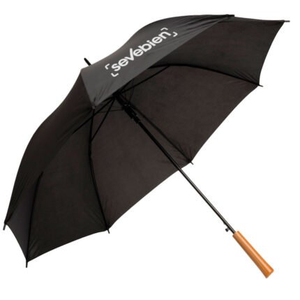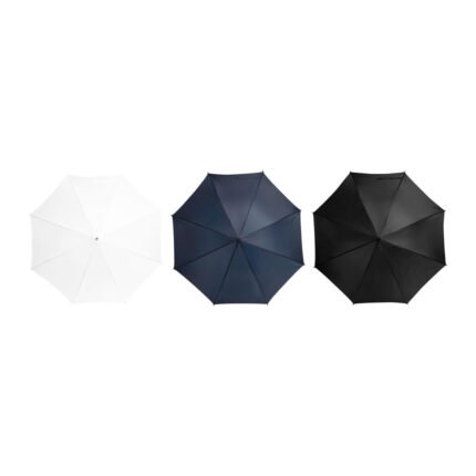 Ø 100 cm. 8 gajos. Ancho gajo 40 cm. Largo total 84 cm. Poliéster, metal y PVC. Paraguas APERTURA AUTOMÁTICA Y CIERRE MANUAL. Eje, varillas y punta metálicas y mango en PVC, símil madera. Botón a presión. Cierre con correa de velcro.