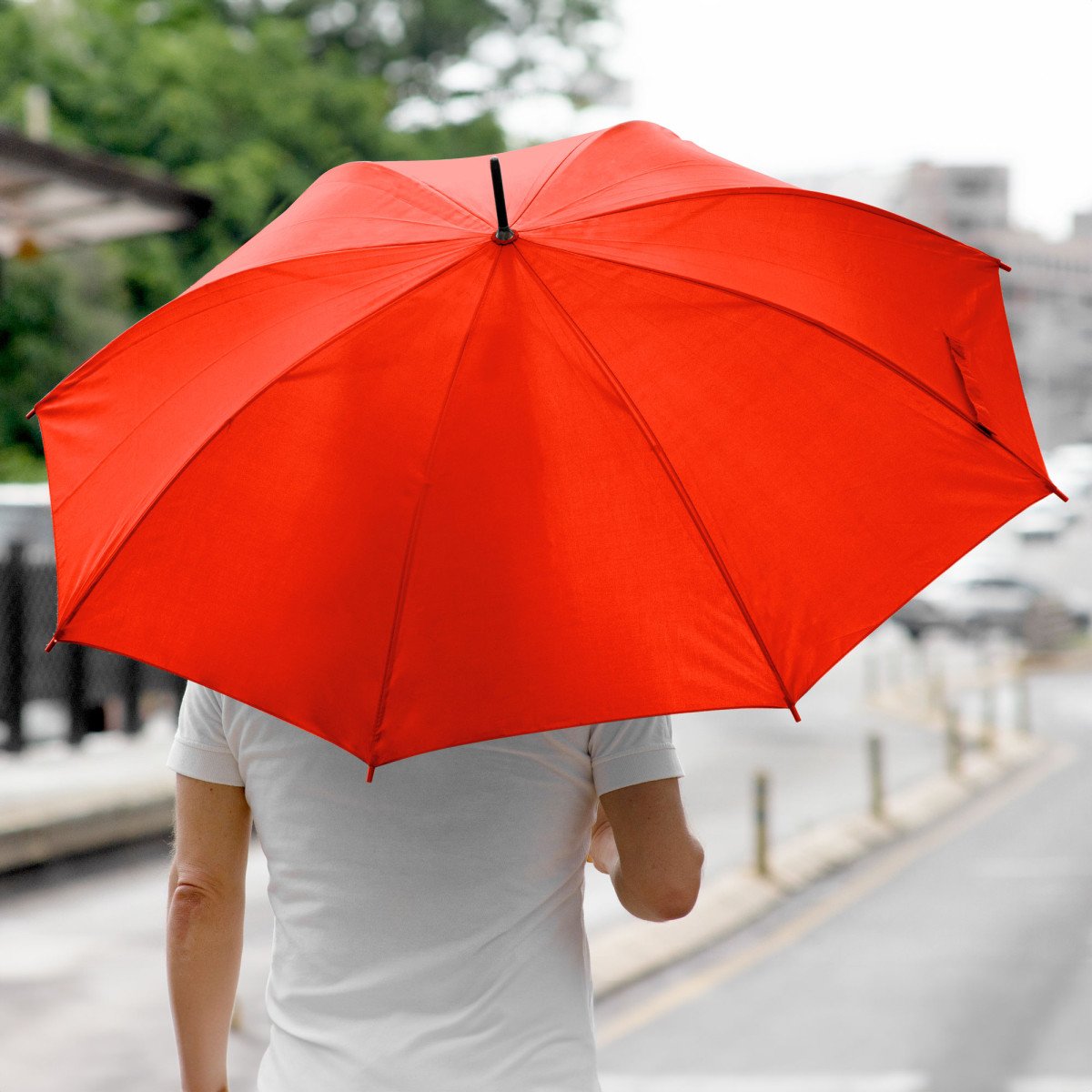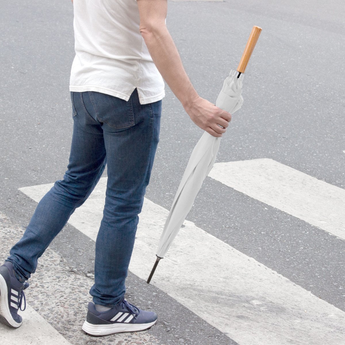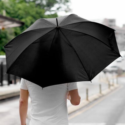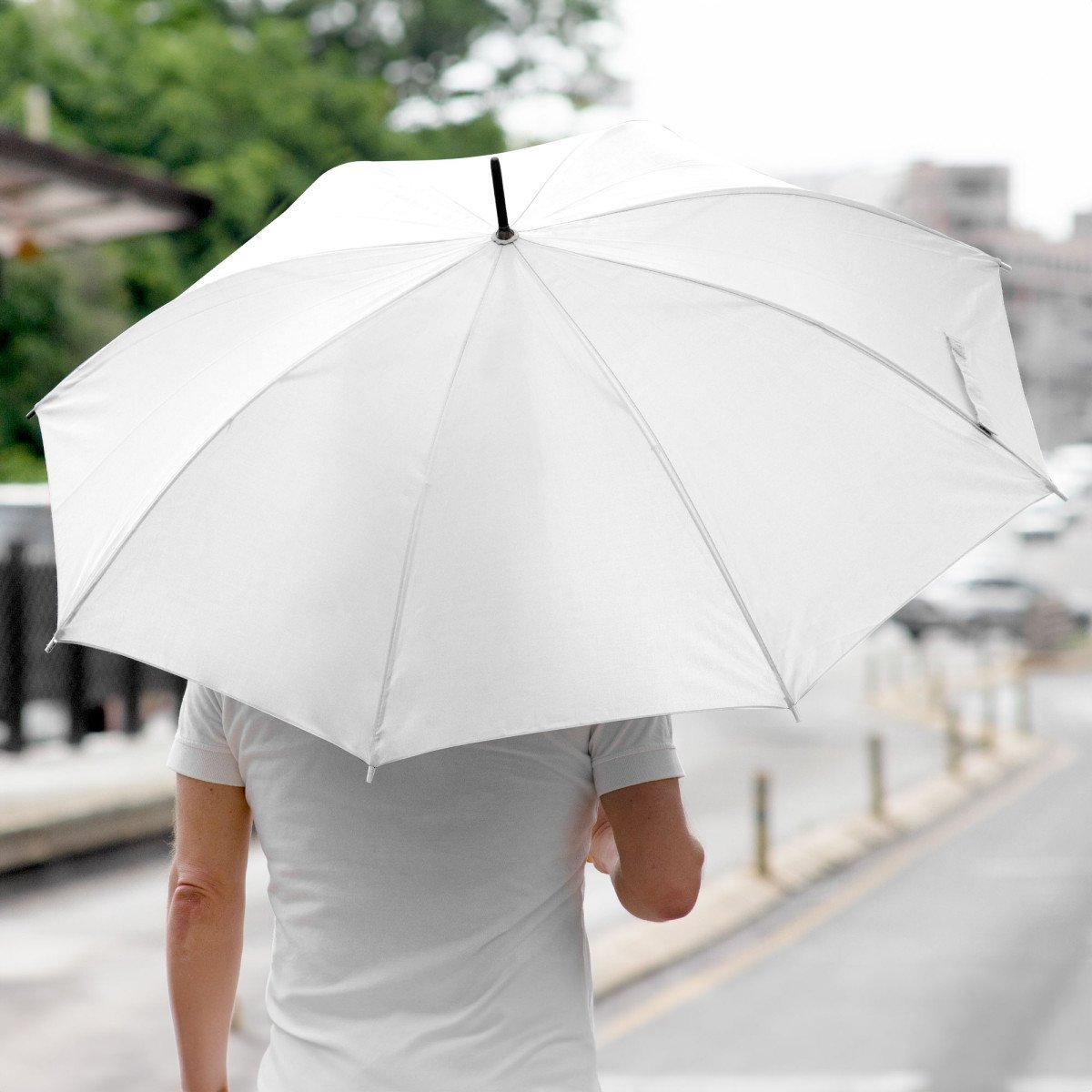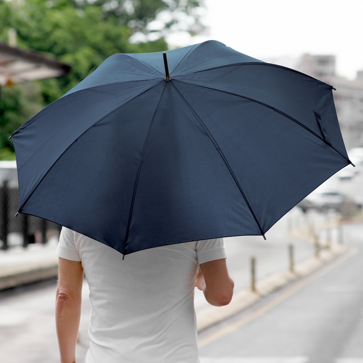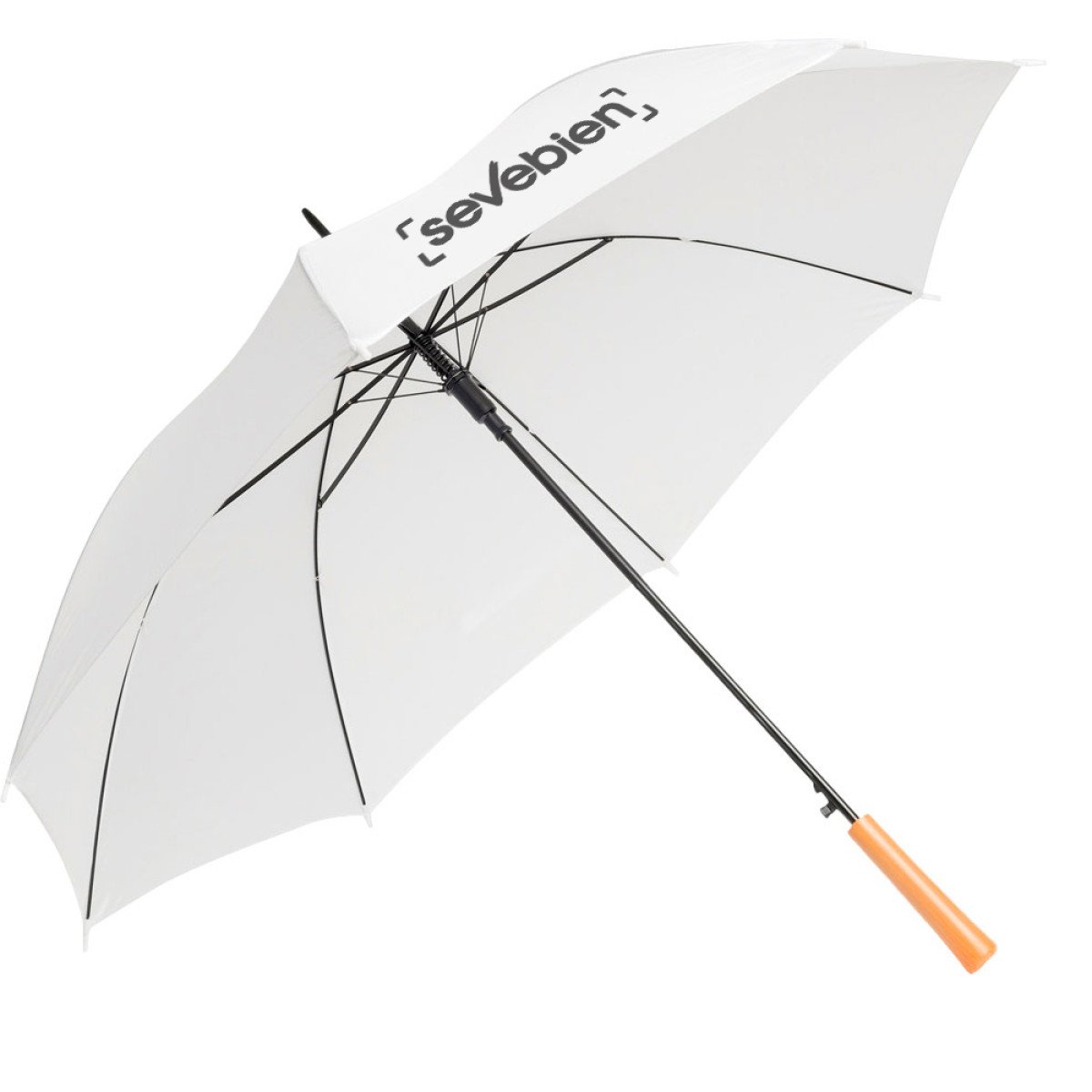 Ø 100 cm. 8 gajos. Ancho gajo 40 cm. Largo total 84 cm. Poliéster, metal y PVC. Paraguas APERTURA AUTOMÁTICA Y CIERRE MANUAL. Eje, varillas y punta metálicas y mango en PVC, símil madera. Botón a presión. Cierre con correa de velcro.