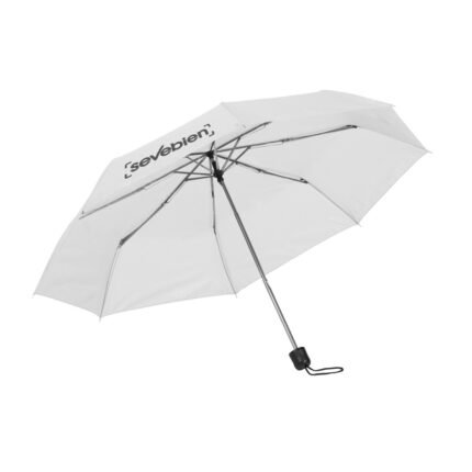 Ø 98 cm. 8 gajos. Ancho gajo 37 cm. Largo cerrado 24 cm. Largo abierto 54 cm. Poliéster, metal y plástico. Paraguas APERTURA Y CIERRE MANUAL. Eje y varillas metálicas. Mango de plástico negro con correa cordón color negro. Cierre con correa de velcro.