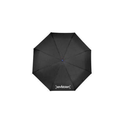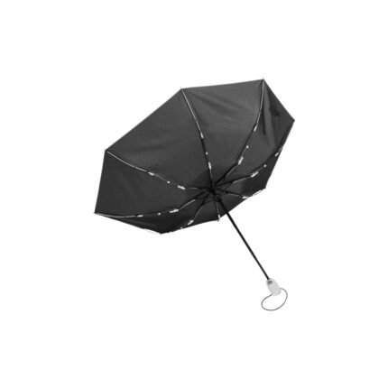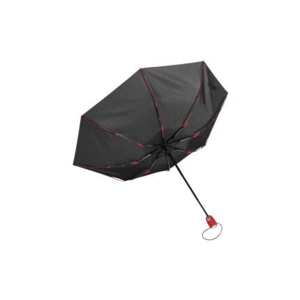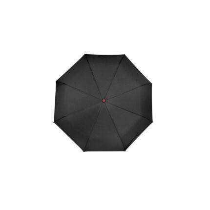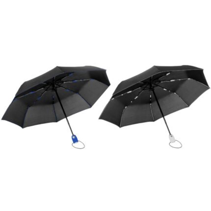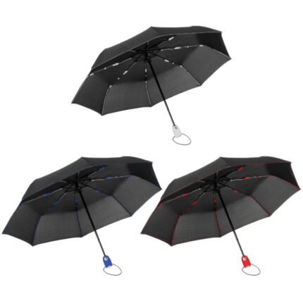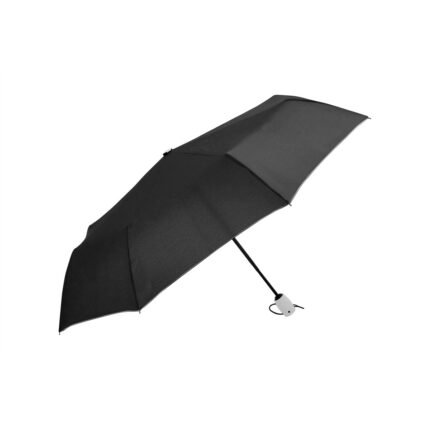 Ø 98 cm. 8 gajos. Ancho gajo 37 cm. Largo cerrado 27 cm. Largo abierto 54 cm. Poliéster, metal y plástico engomado. Paraguas APERTURA Y CIERRE AUTOMÁTICO con sistema antiviento. Eje metálico y varillas de fibra de vidrio con detalles en color. Mango plástico engomado de color con cordón elástico color negro. Botón a presión. Funda con costura de color. Cierre con correa de velcro.