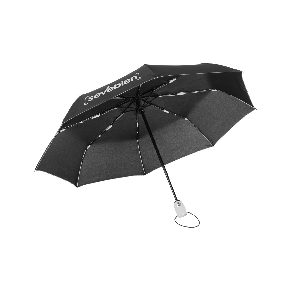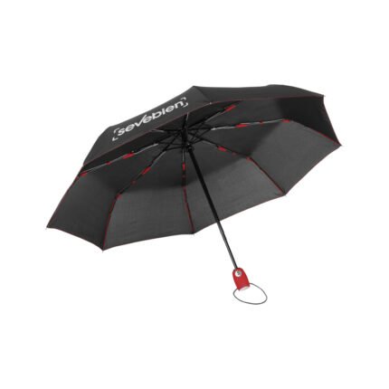 Ø 98 cm. 8 gajos. Ancho gajo 37 cm. Largo cerrado 27 cm. Largo abierto 54 cm. Poliéster, metal y plástico engomado. Paraguas APERTURA Y CIERRE AUTOMÁTICO con sistema antiviento. Eje metálico y varillas de fibra de vidrio con detalles en color. Mango plástico engomado de color con cordón elástico color negro. Botón a presión. Funda con costura de color. Cierre con correa de velcro.