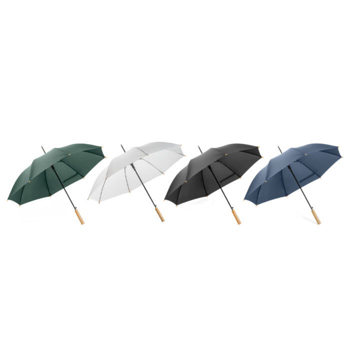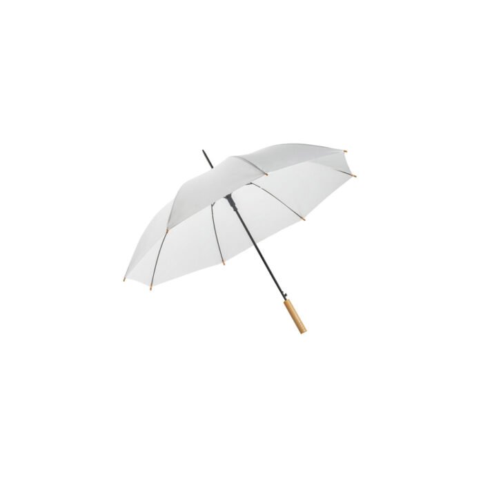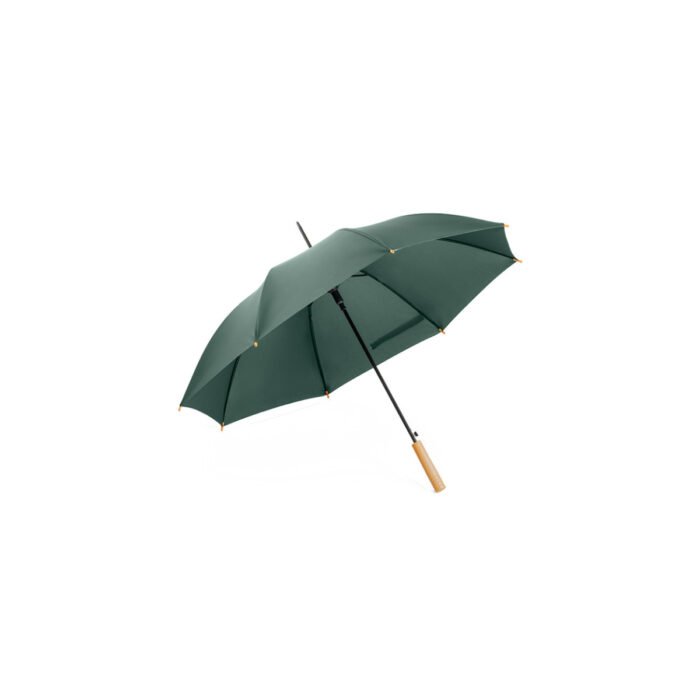 Paraguas de 8 gajos con tela impermeable de rPet (plástico reciclado). Con mango de madera, y estructura y puntera metálicas. Con mecanismo de apertura automática.*La tonalidad del color del mango de madera puede variar según la partida.