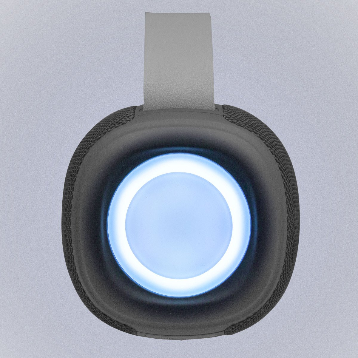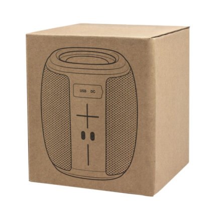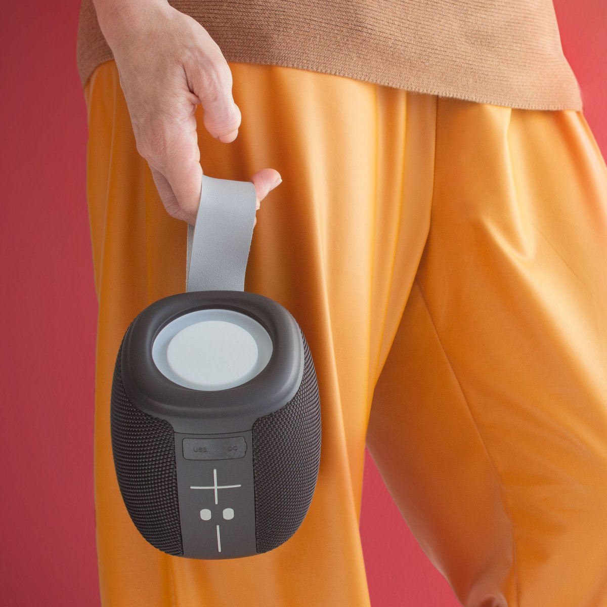 Ø 13 x 11 x 11 cm. Plástico ABS + Tejido resistente al agua + Silicona + Poliuretano. Correa en poliuretano color gris combinando con el panel de control. 2 modos de luz: cálida y fría. Cable de carga USB-C / DC5V. Presentación en caja de regalo Kraft.Potencia: 10 Watts