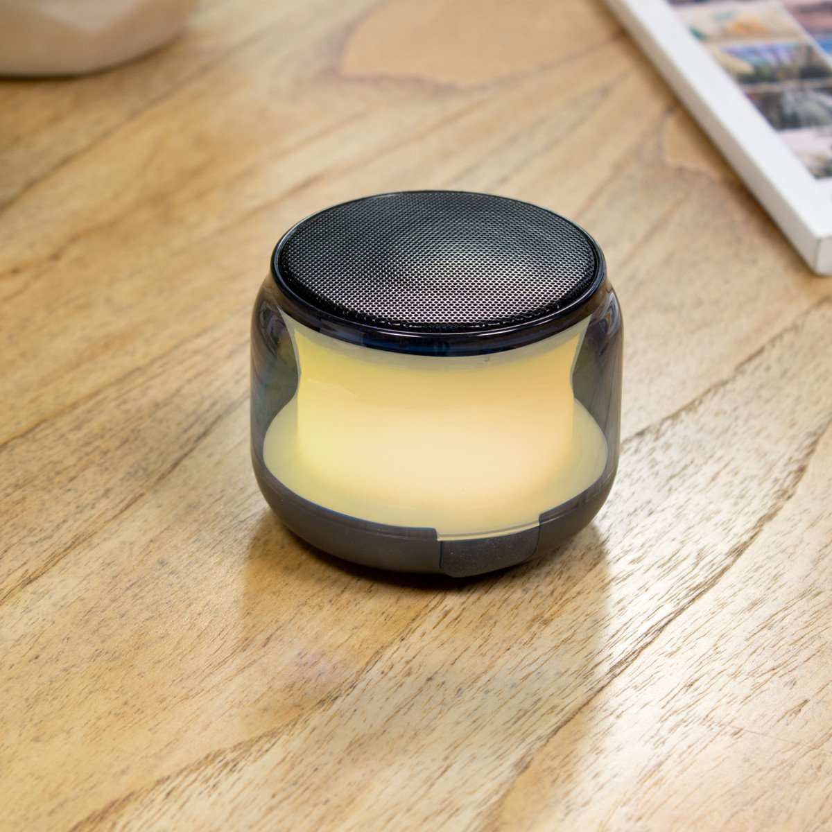 Ø 7,5 x 6 cm. Parlante Bluetooth estéreo. ABS transparente con malla metálica en la parte superior. Botones en color negro. Led que cambia entre 7 colores y 8 modos de luz para elegir. Potencia 3W. Versión Bluetooth: 5.0. capacidad de la batería: 500 mAh. Cable de carga y conexión USB-C en color negro. Presentación en caja de regalo.