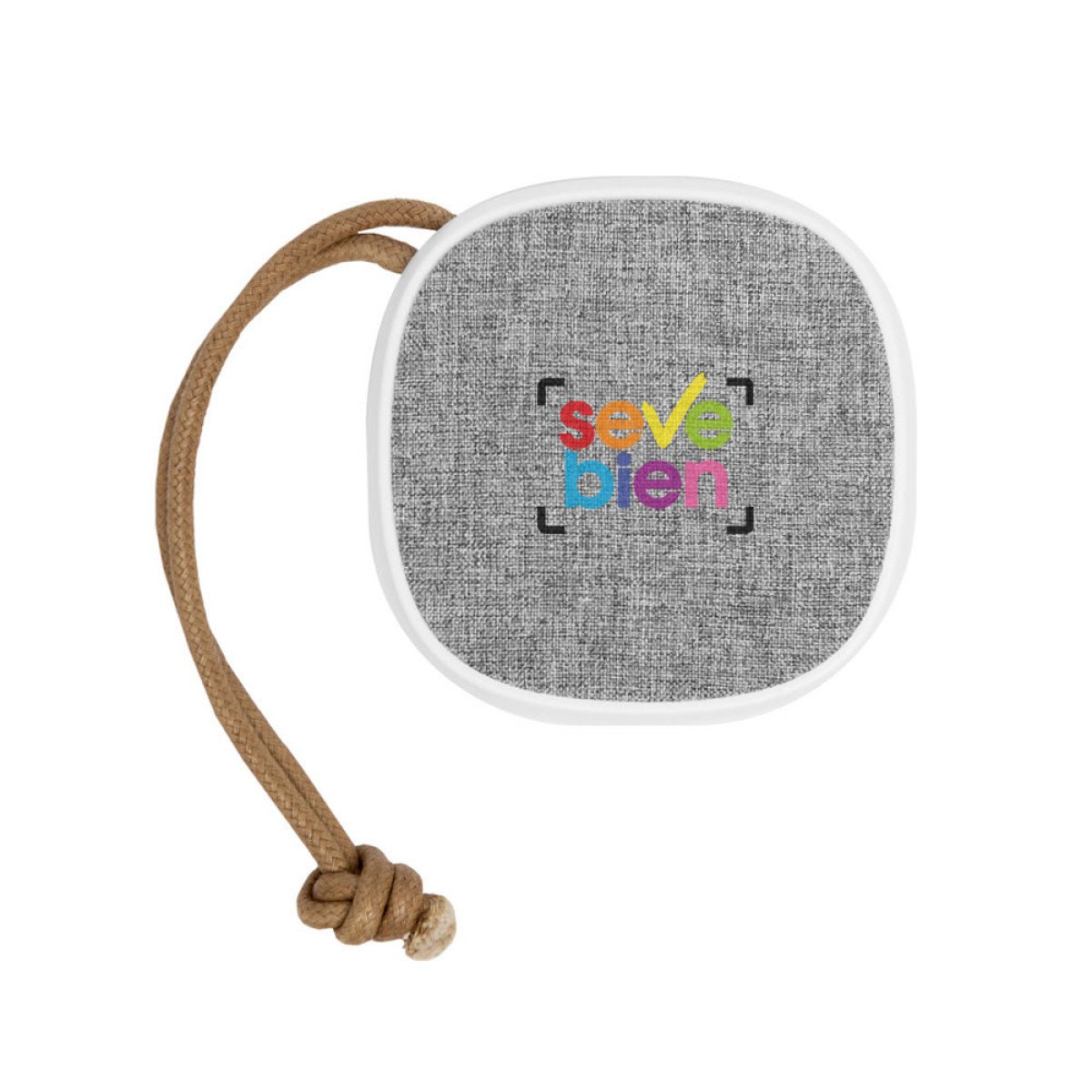 9 x 9 x 4,4. Plástico. Parlante/bocina bluetooth cubierto en tela. En la parte inferior engomado antideslizante con botones para encender o apagar, play/pausa y responder llamadas. Botón de retroceso y avance, este último, si se mantiene presionado durante unos segundos pasa al siguiente sonido, estos mismos botones permiten aumentar o disminuir el volumen. Puerto de carga USB-C. Incluye cable. Lazo de tela color marrón que permite colgarlo. Duración de la batería 8 – 12 hs aprox. Presentación en caja de regalo.