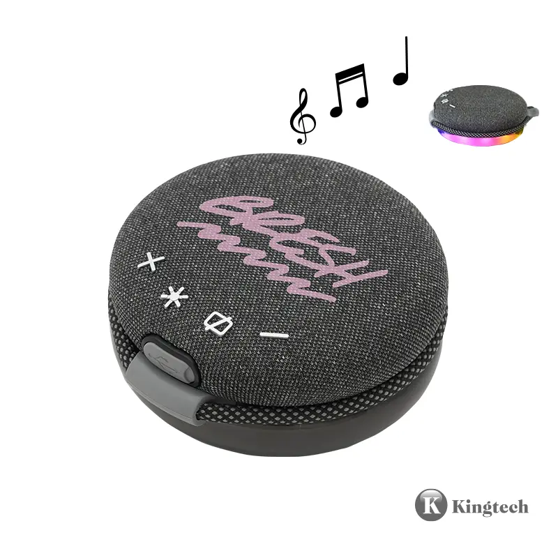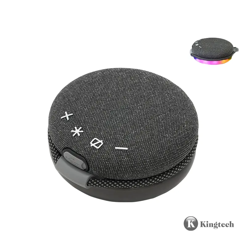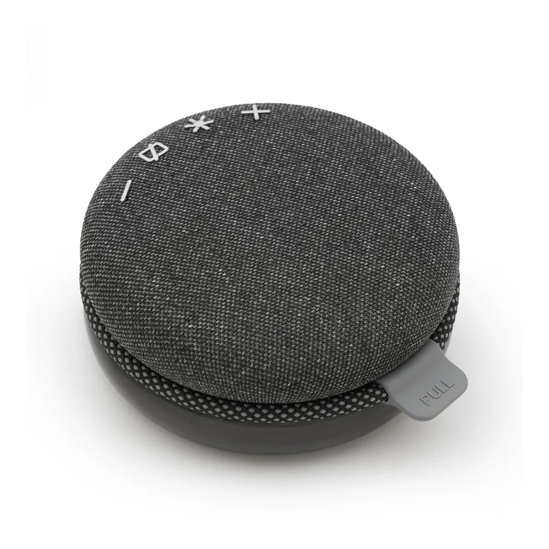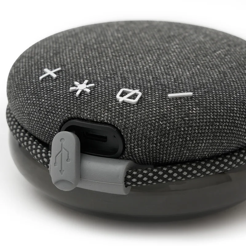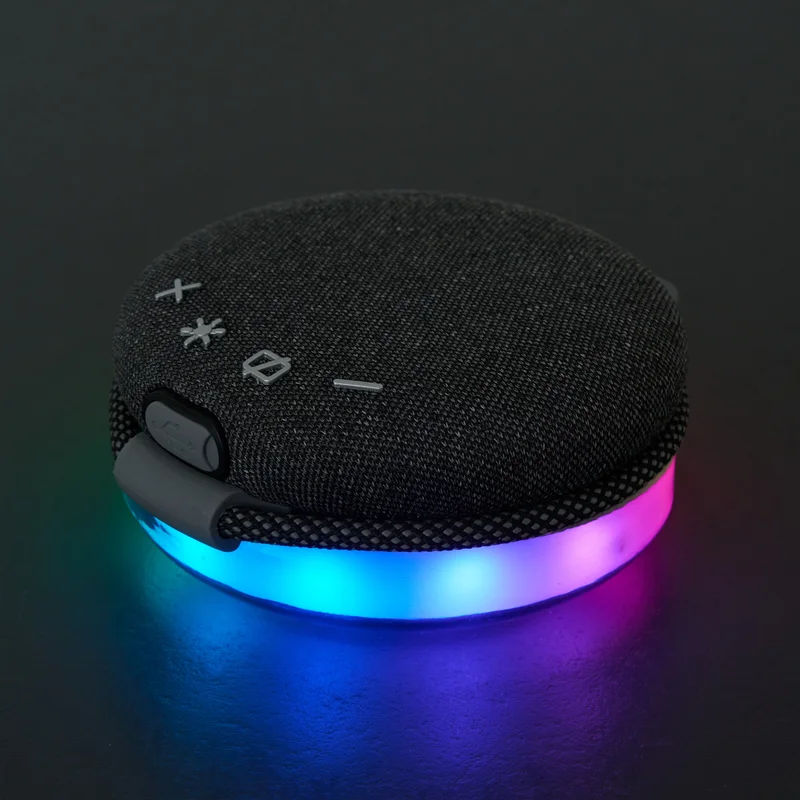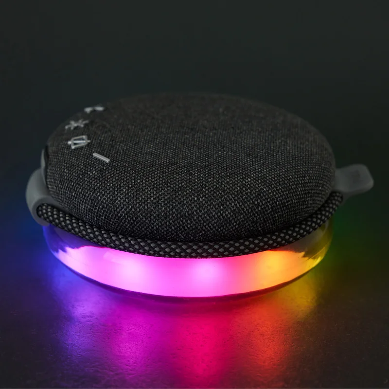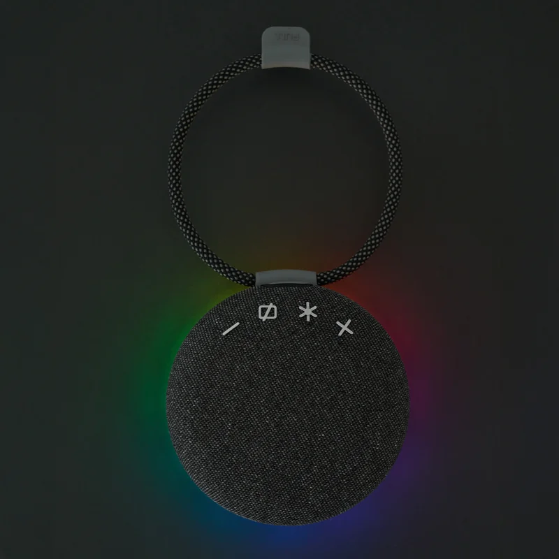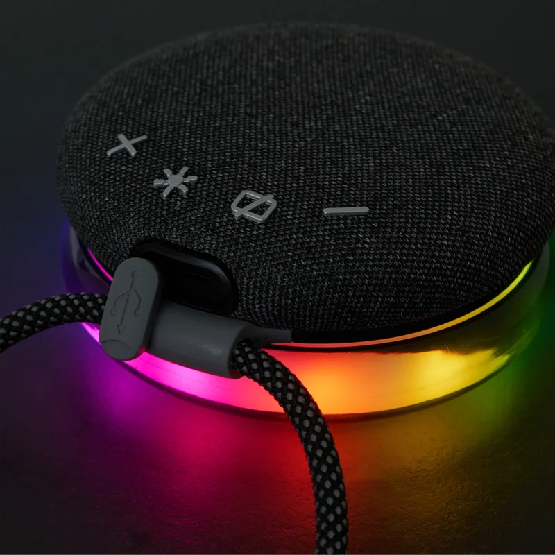 El parlante Fullmoon cuenta con luces led multicolor y una correa ajustable para que lo lleves a donde quieras. Está fabricado en ABS y silicona, con un recubrimiento de tela.