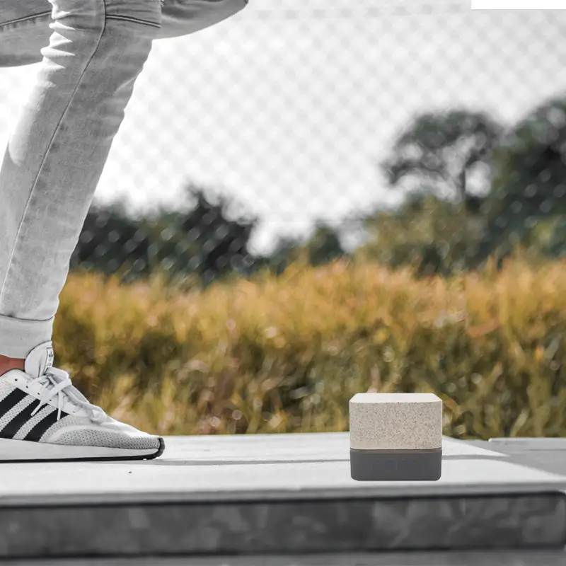 Parlante portátil con tecnología Bluetooth 5.0. Realizado en combinación de PP con Silicona y Wheat Straw, pasta de tallo de trigo, un material sustentable que reduce el consumo de plásticos vírgenes. Su peso es de 116gr, y entre sus características técnicas encontramos: