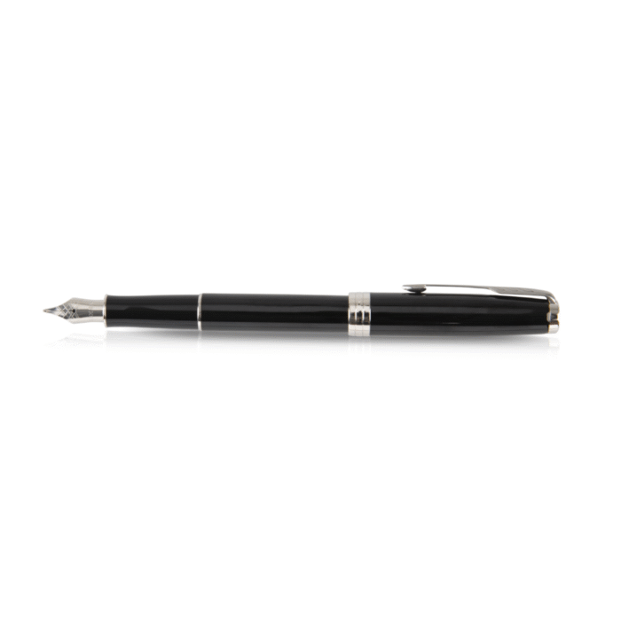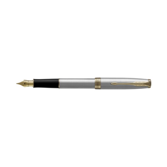 Pluma de acero inoxidable dorada con punta media. Este modelo es el símbolo de la elegancia y una muestra clásica de estilo refinado de la marca. Incluye estuche con el logo de Parker. Tinta Negra.