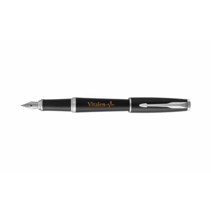 Con cuerpo de laca y acabado mate, agarre de resina de color brillante, plumín de acero resistente. Con detalles plateados, incluye un cartucho de tinta. Tinta Azul. Acabado de impresión láser en tono cobrizo/dorado.