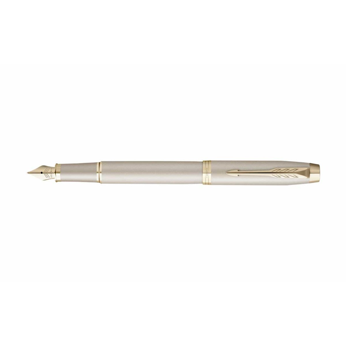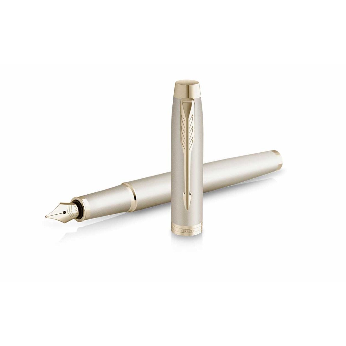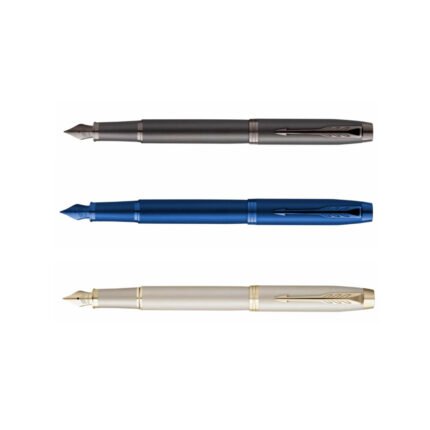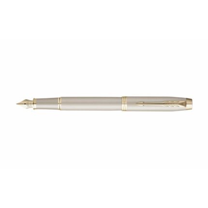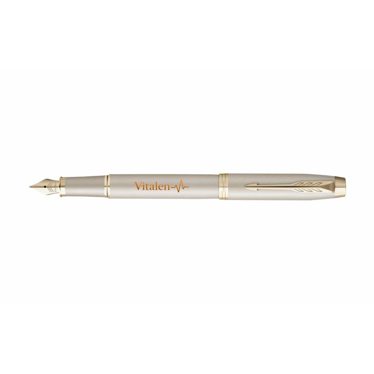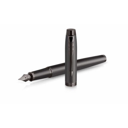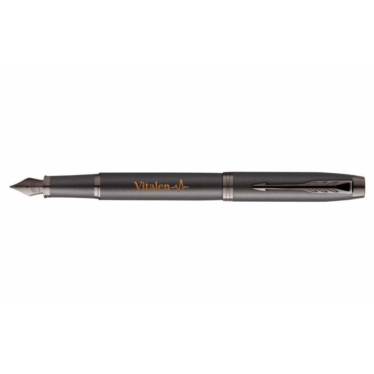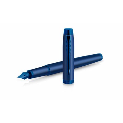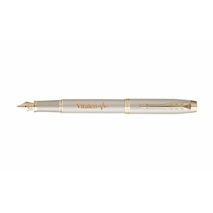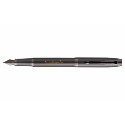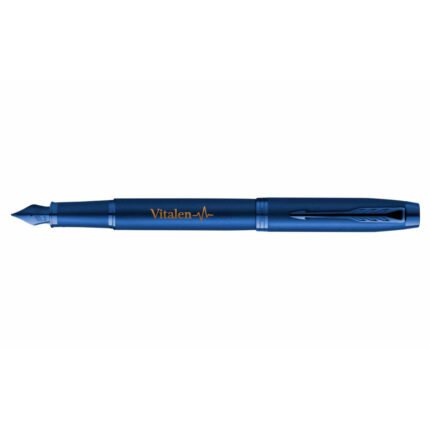 Pluma fuente de punta media, con cuerpo de acero inoxidable y diseño elegante completamente monocromático. Tinta Azul. Acabado de impresión láser en tono cobrizo/dorado.