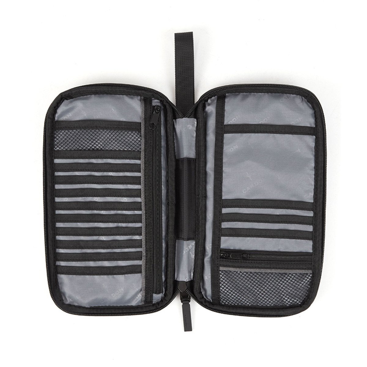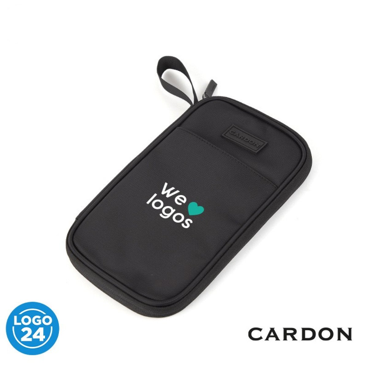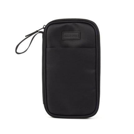 Porta pasaporte confeccionado en Polyester con cierre en tono en todo su contorno y cabezal metálico color negro. Interior con 13 espacios ideal para tarjetas o credenciales, más 3 solapas para documentación varia (dos de ellas con red) y, un bolsillo del largo total con cierre independiente ideal para guardado de dinero o documentación importante. Cuenta con un espacio para guardar un bolígrafo. Bolsillo externo frontal sin cierre y correa de 10 cm para facilitar el agarre. Dimensiones: 26 x 13 x 2,5 cm (Alto x Longitud x Ancho). Cardon.