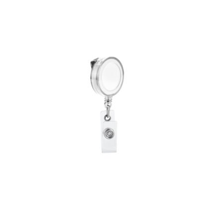 Cuerpo translúcido, con clip metálico y mecanismo extensible hasta 90 cm. El mecanismo retráctil permite presentar la tarjeta o credencial de forma segura y cómoda. Viene con clip transparente y botón para añadir tarjeta. ø32 x 9 mm