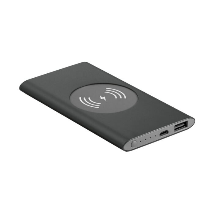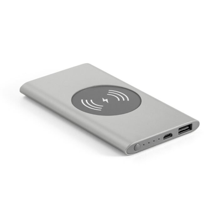 Power Bank y cargador inalámbrico de aluminio con batería de polímero de litio. Cuenta con una capacidad de 4000 mAh y una vida útil de mas de 500 ciclos. Tiene una entrada de 5V/2A, salida de 5V/2A y LED con indicador de carga. Incluye un cable USB/micro USB para cargar la batería y es suministrado en una caja de regalo