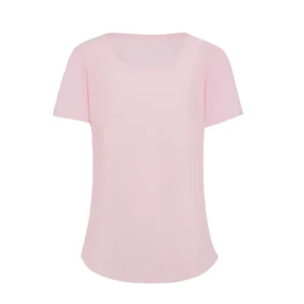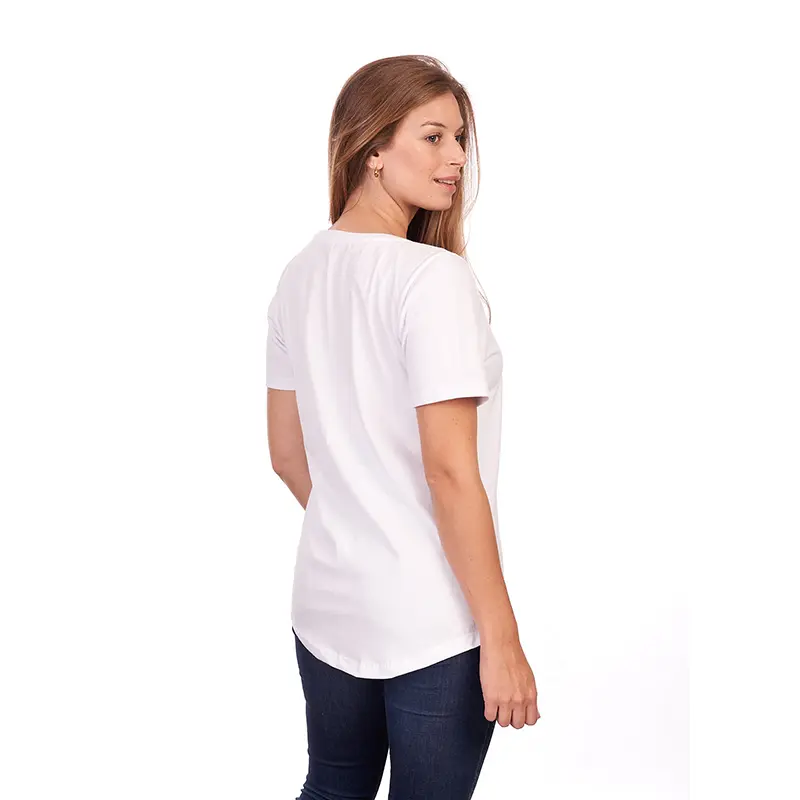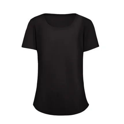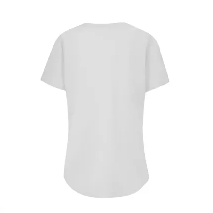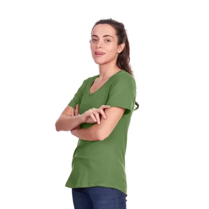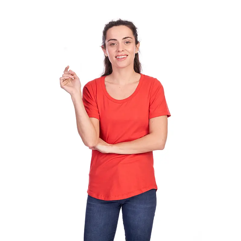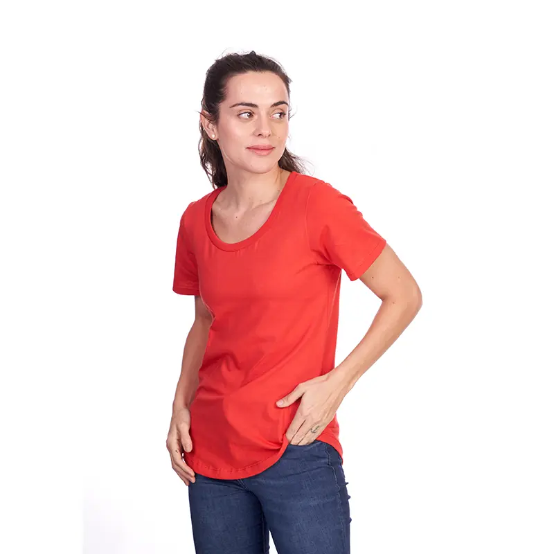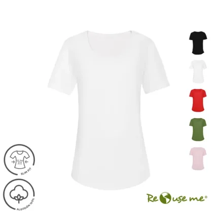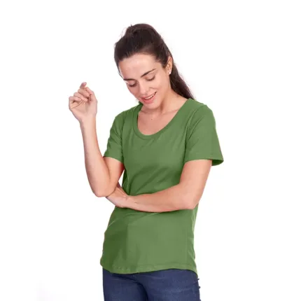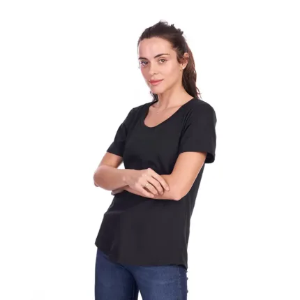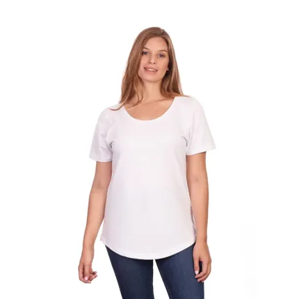 Remera de manga corta para mujer en corte slim fit, con cuello bote en ribb de algodón. Esta prenda está confeccionada 100% en algodón 24/1 peinado, un recurso ecológico renovable y sostenible.