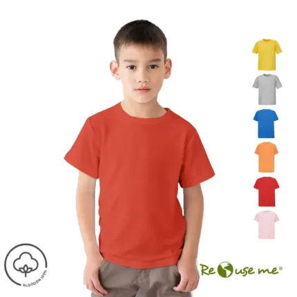 Remera de manga corta infantil, con cuello redondo en ribb de algodón. Esta prenda está confeccionada 100% en algodón 24/1 peinado, un recurso ecológico renovable y sostenible.