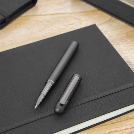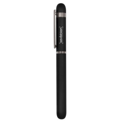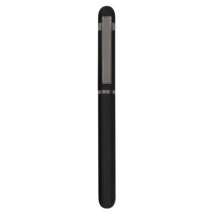 Metal. Cuerpo de aluminio. Roller. Apertura con tapa a presión. Clip y anillos metálicos color plata. Tinta Negra. Destape electroplateado en ambas partes. Presentación en estuche con cierre magnético.