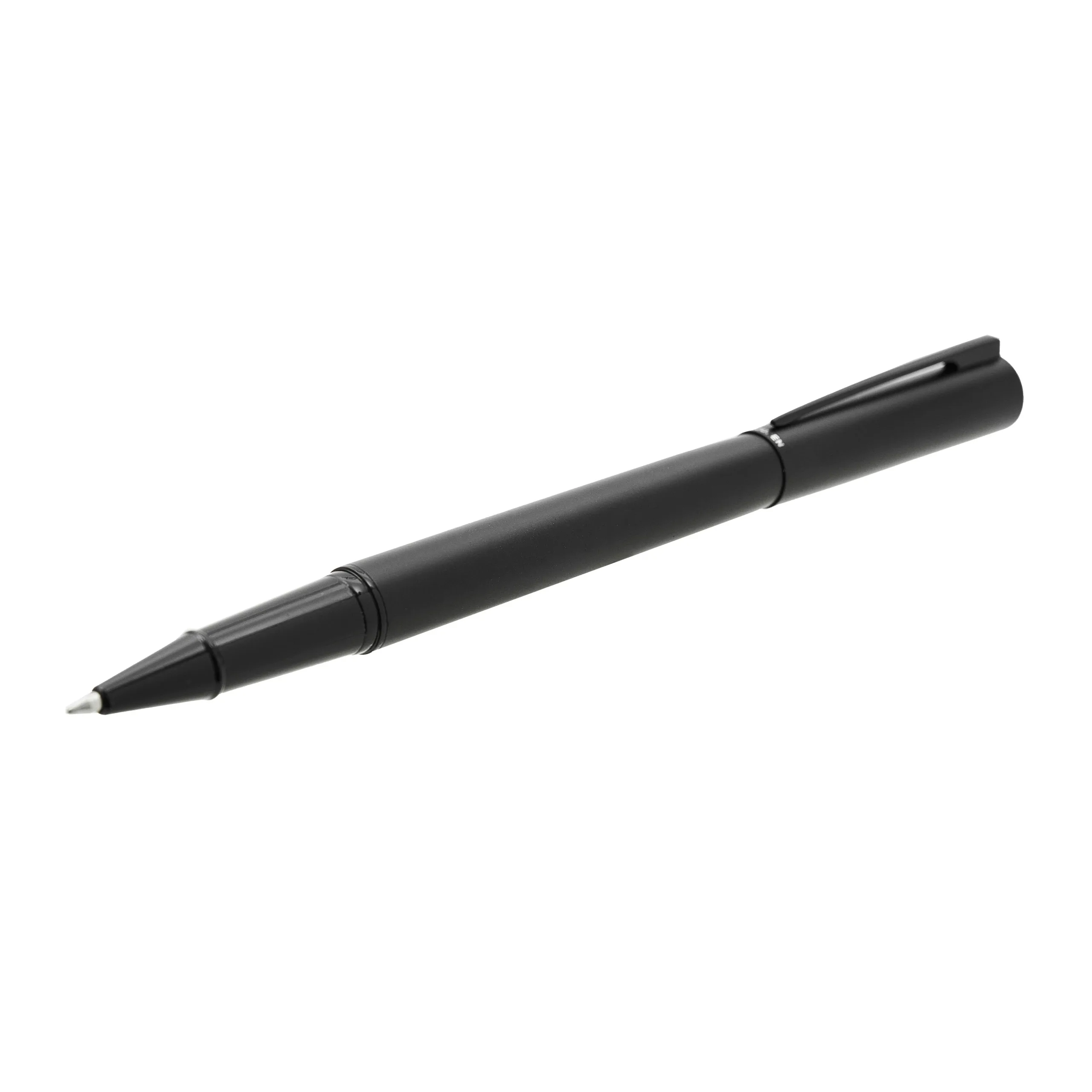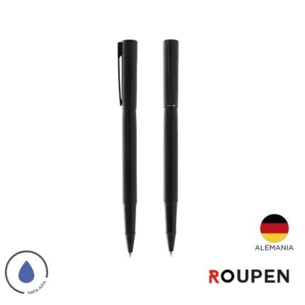 Bolígrafo roller de cuerpo metálico en acero con detalles en negro mate. Cuenta con tinta azul. Medidas: 13.6 x 1.25 cm. Roupen.