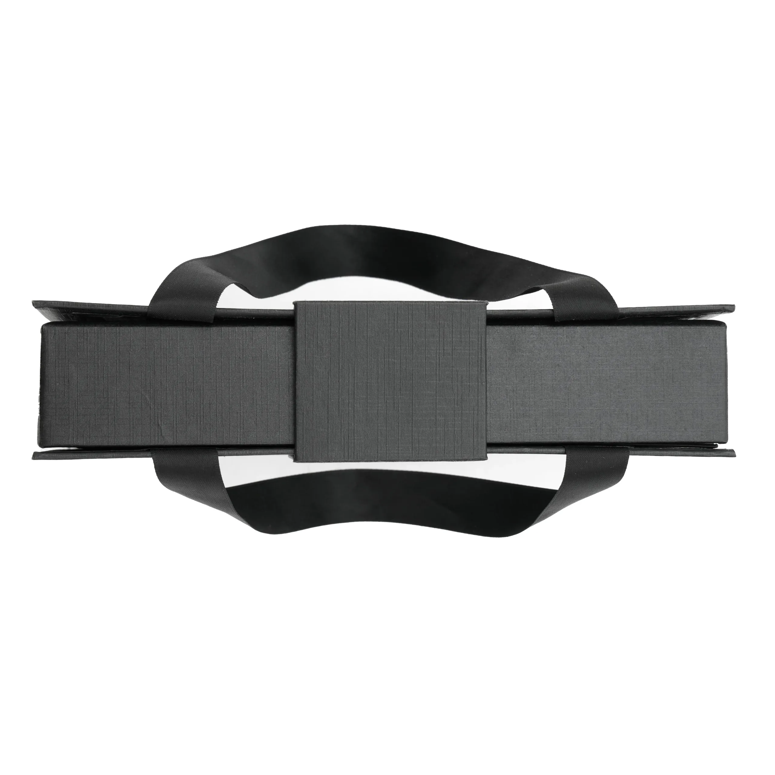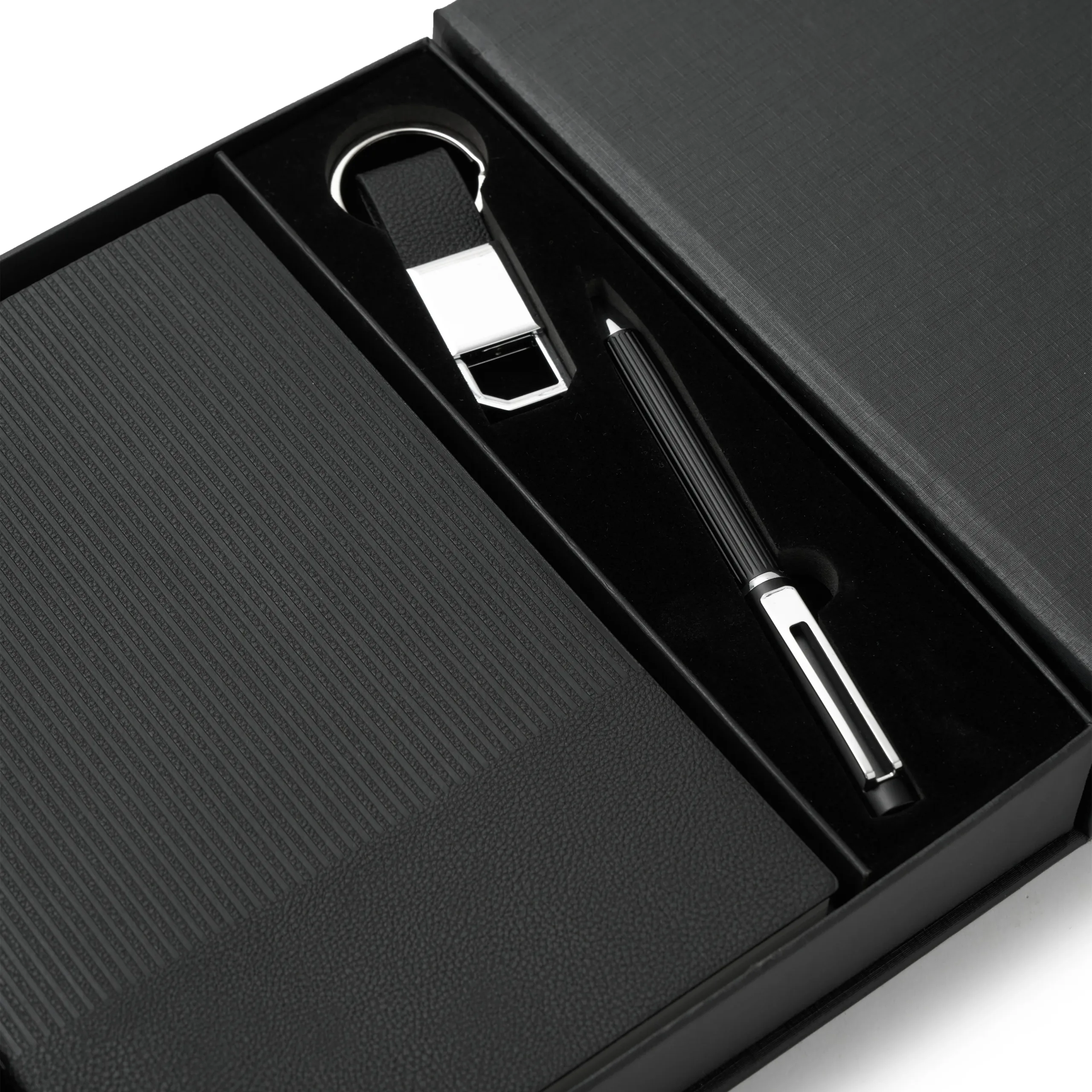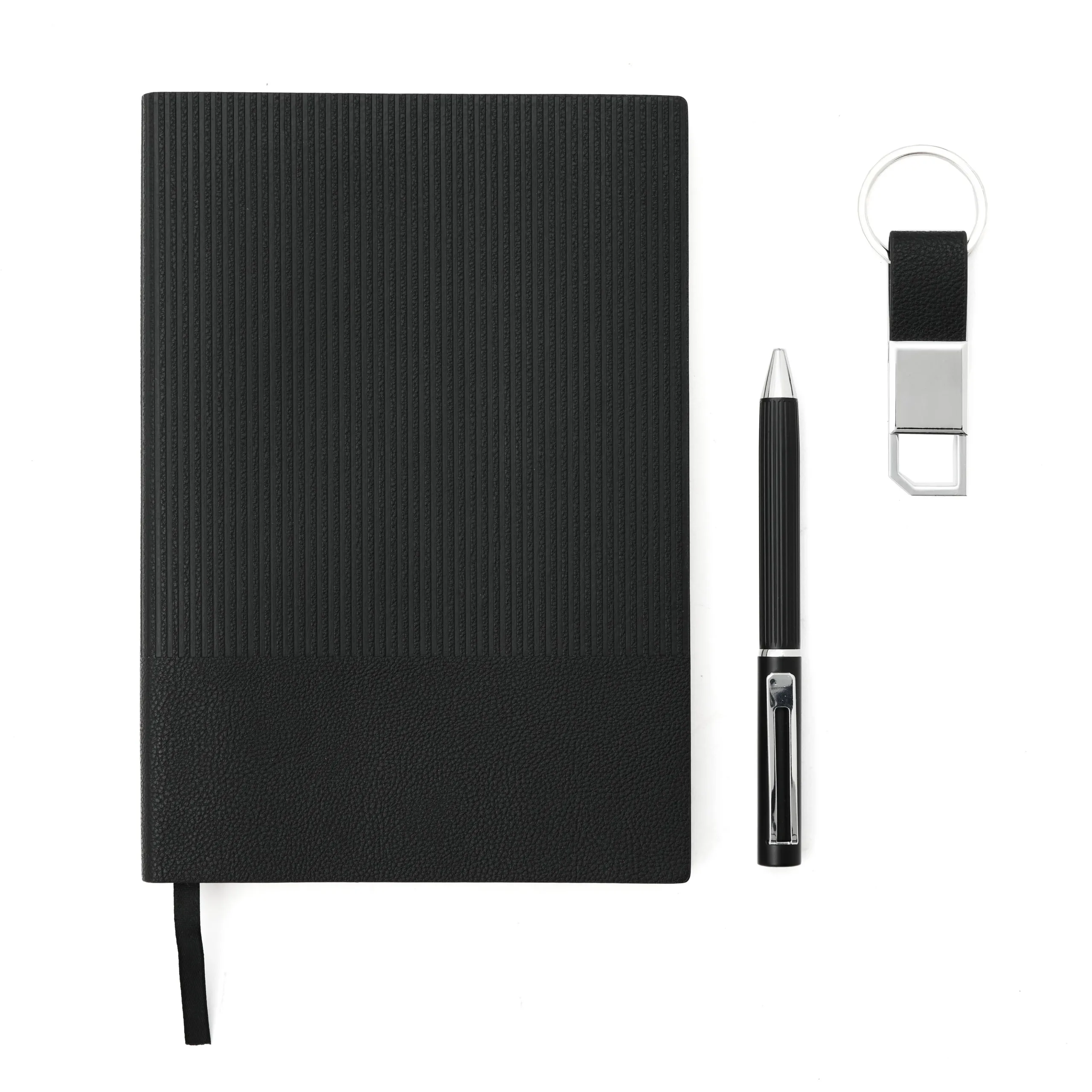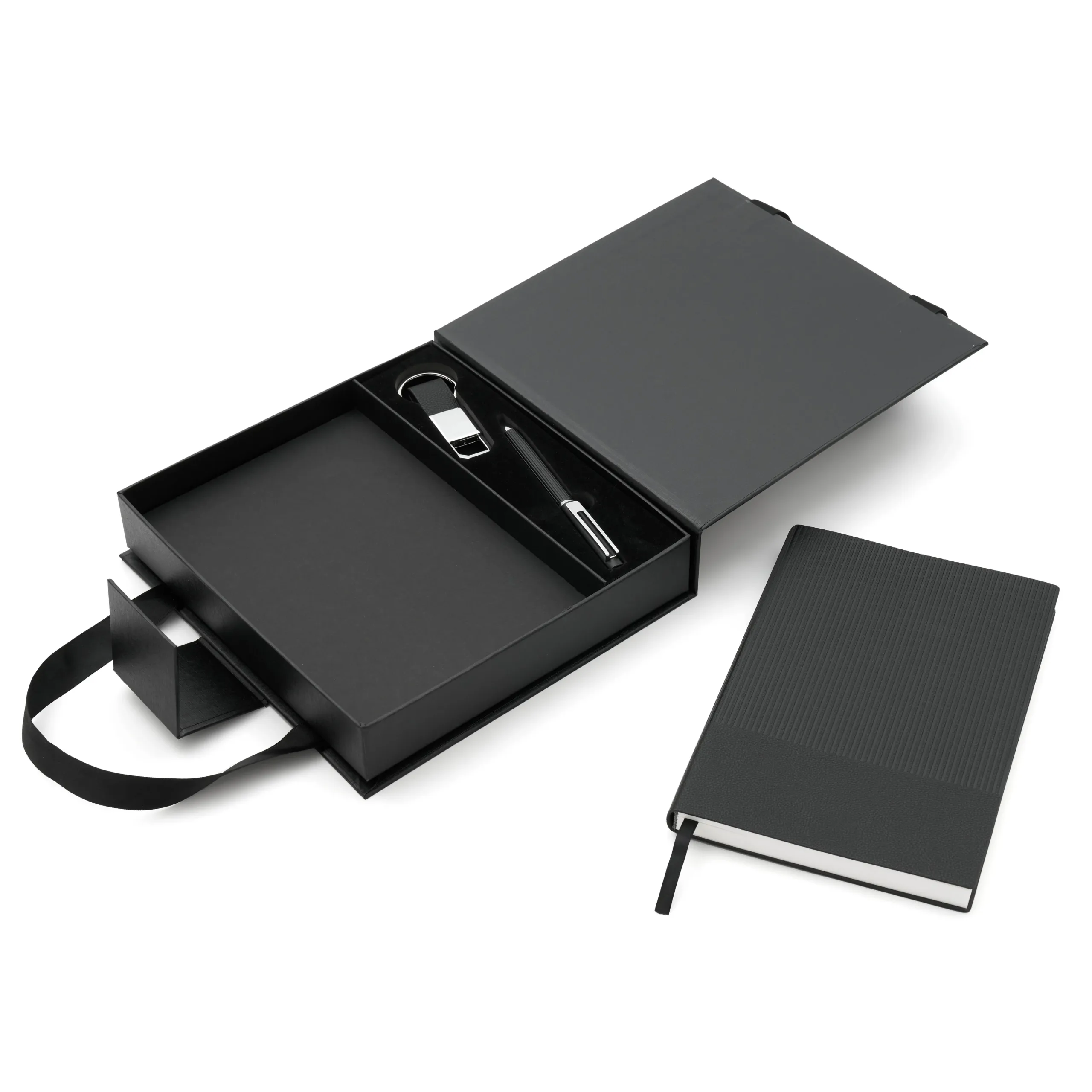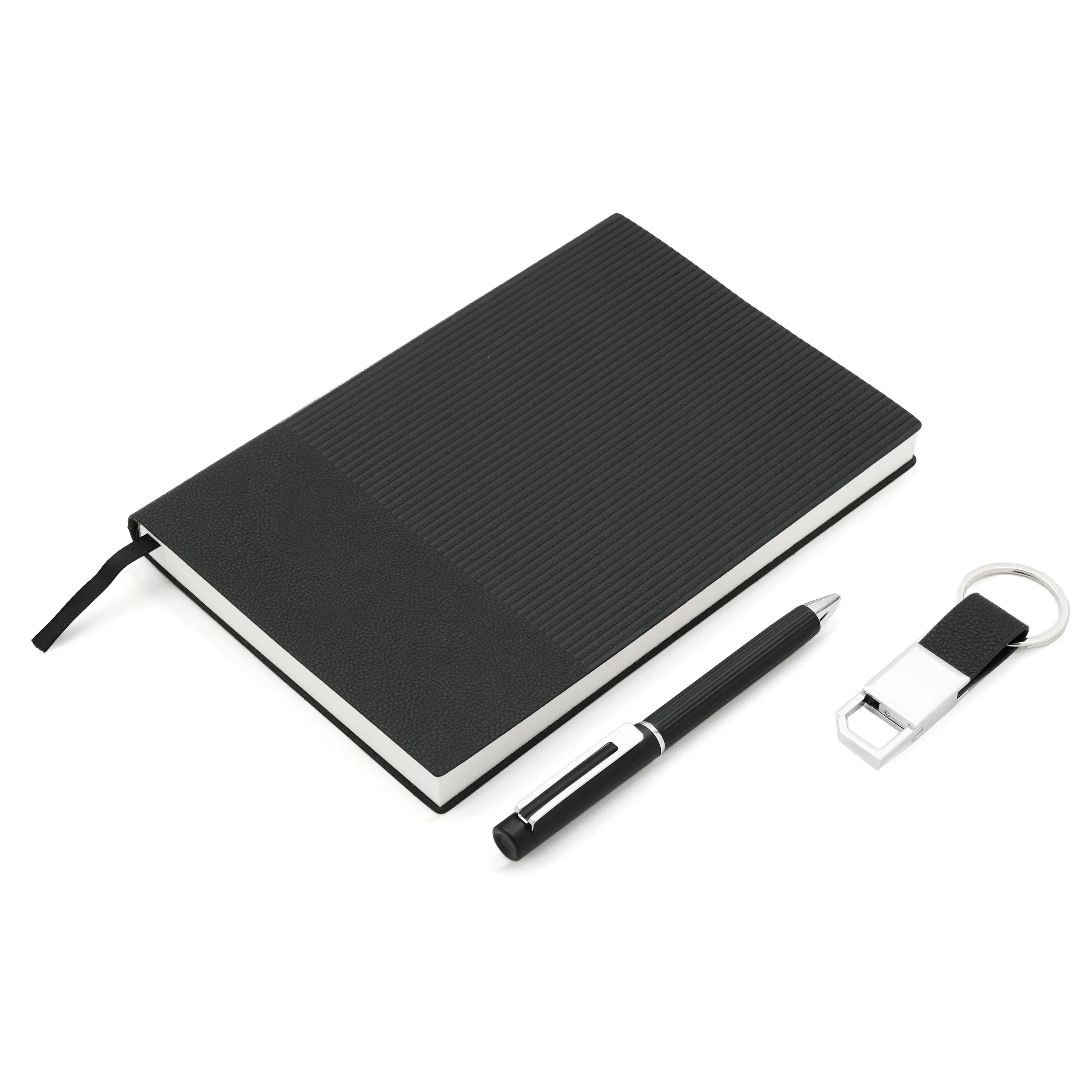 Elegante set que incluye un cuaderno A5 rayado de PU (80 g, 100 hojas, 21 x 14 cm), un bolígrafo de tinta azul y un llavero, todo presentado en una caja de papel kraft negro con acabado mate, que incluye tiras de cinta de raso para facilitar su transporte. Es un producto ideal para regalar en eventos corporativos o fechas especiales.