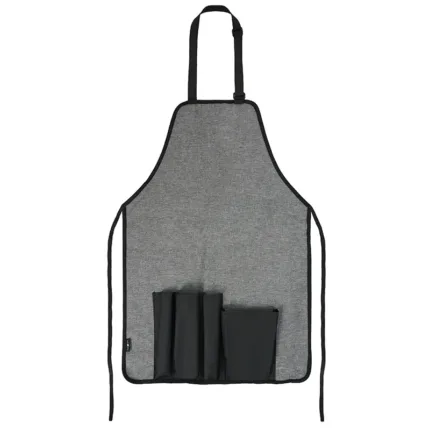 Set parrillero con delantal, espátula, tenedor, pinza y guante. El delantal de policanvas cuenta con compartimientos para guardar los utensilios fabricados en acero inoxidable 420, madera y poliéster. Incluye espátula de 36 cm, tenedor de 35 cm, pinza de 36 cm y un guante resistente al calor. Ideal para hacer asados cómodamente, con todo ordenado y fácil de llevar para las parrilladas y juntas al aire libre.