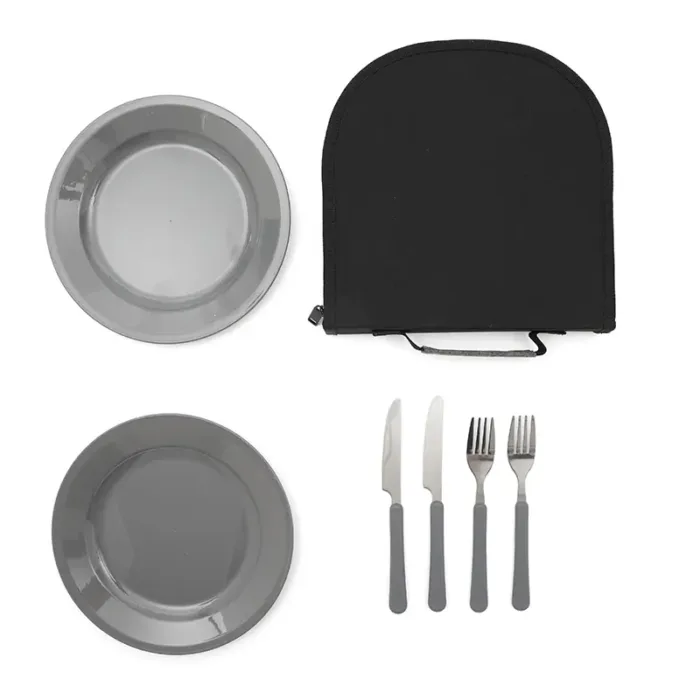 Set de asado con funda organizadora compacta. Hecho en polycanvas de alta calidad, con detalles reforzados y cierre de cremallera resistente. Cuenta con bolsillo frontal, manija superior, 2 tenedores, 2 cuchillos y 2 platos, todo sujeto con bandas elásticas. Es ideal para llevar a picnics, campings o disfrutar un asado al aire libre.